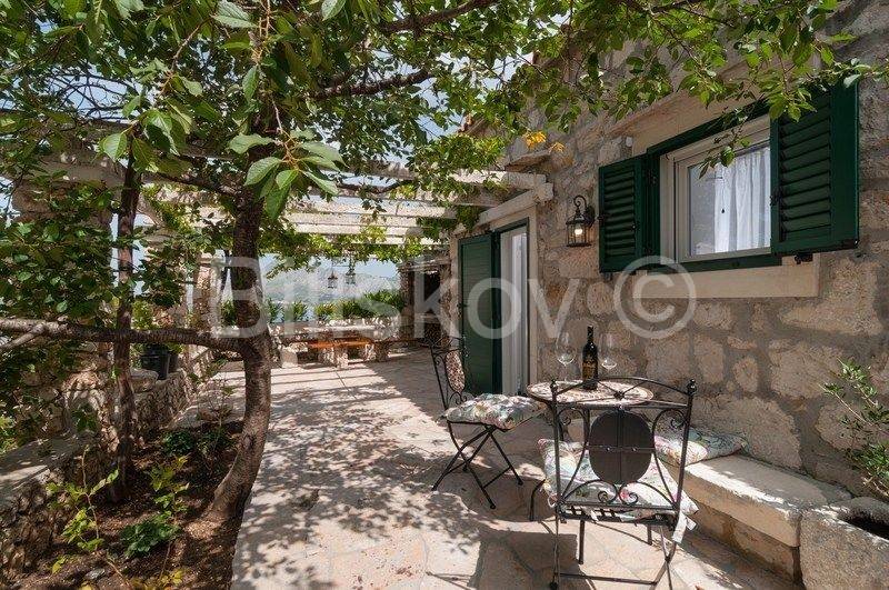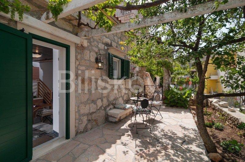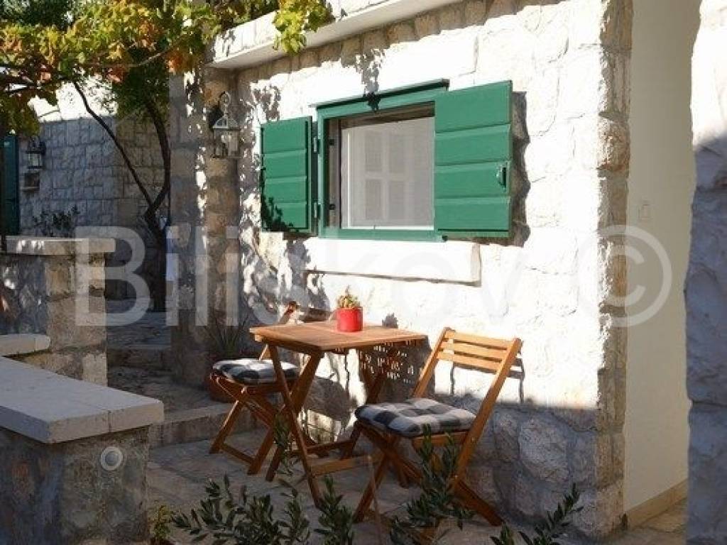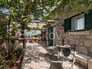4 autohtone dalmatinske kuće, obnovljene i preuređene u tradiocionalnom dalmatinskom duhu. Najveća kuća- glavna kuća ima tlocrtnu površinu od 82 m2 i sastoji se od: suterena u kojem je smješten prostor za doručak sa svom potrebnom opremom i konoba. U prizemlju se nalazi kuhinja, blagovaonica, kupaonica i prostrani dnevni boravak. Na prvom katu su tri spavaće sobe i kupaonica, te na drugom katu zaseban apartman sa koje terase se pruža prekrasan pogled na more. Uz kuću se nadovezuje jedan manji apartman. U dvorišnom dijelu nalaze se 3 manje kućice, svaka zesebni apartman. Dvorišta je veličine 270 m2, te garaža 38 m2, ukupna površina svih objekata 322 m2.