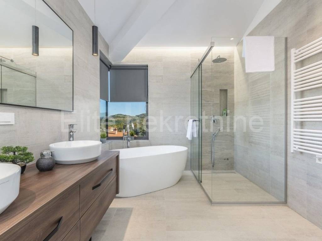 Vila je građena u potpunosti od Ytong-a 40 cm debljine, stropovi su 15 cm s ojačanjem 12 cm prešane vune, krovni pokrov Gerard 50 god. tvorničke garancije, armirana betonska bazenska školjka, vanjske obloge( zidne i podne) komplet od prirodnog kamena, preljevni bazen s dodatnom opremom, ima automatsko doziranje za održavanje kvalitete vode i pumpe za čiščenje vode, ALU stolarija sa troslojnim toniranim staklima, Screen rolo platna s ugrađenim komarnicima za zaštitu od sunca, staklene balkonske sigurnosne ograde, grijanje, hlađenje i topla voda sa WRW dizalicom topline DAIKIN, vanjski natkriveni jacuzzi, sauna u unutarnjem dijelu, prostor za fitnes s posebnim klima uređajima, postavljeni video nadzor, unutarnji alarmni nadzor kuće, separator za recikliranje otpadnih voda, automatskog navodnjavanje HUNTER, cisterna za pohranjivanje oborinskih voda, travnata, zelena površina s više od 100 posađenih biljaka, sanitarije CATALAN i GROHE, lamelirani prirodni parket u cijeloj kući osim kuhinje i kupaonice, Natkriveni parking aluminijskom pergolom ( 4 parkirna mjesta) , svi kreveti veličine 200X200(madraci), kompletan namještaj rađen je po mjeri