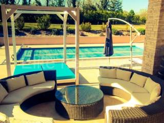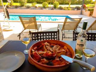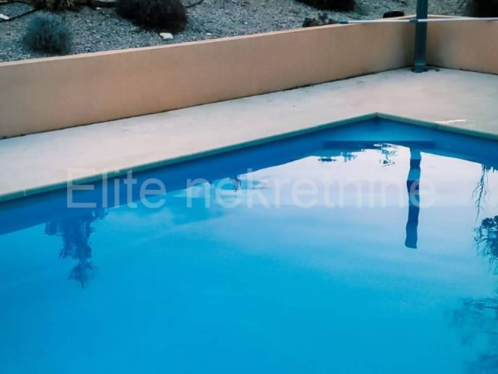 The pool is 42m2 filled with salt water. The edge of the pool is paved with stone, and the sunbathing area around the pool is equipped with deck chairs. Next to the pool is a grill area with an open fireplace for grilling.