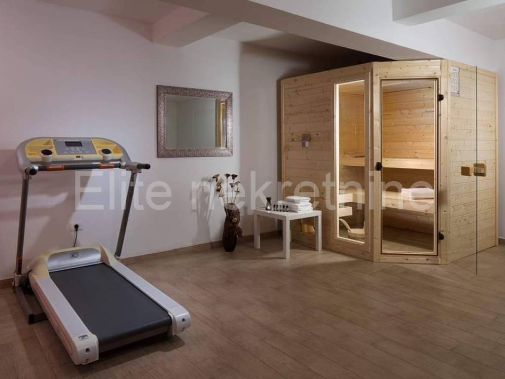 The basement consists of a spa and wellness area with a sauna, jacuzzi, toilet, shower and exercise equipment.