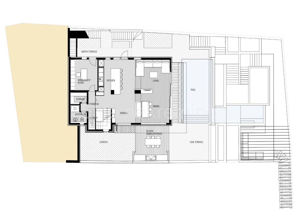 Okružuje ju prostrana okućnica od 474 m2 na kojoj se nalazi preljevni bazen i sunčalište.