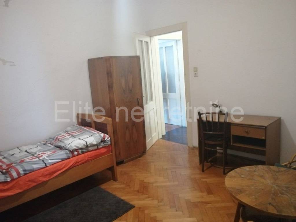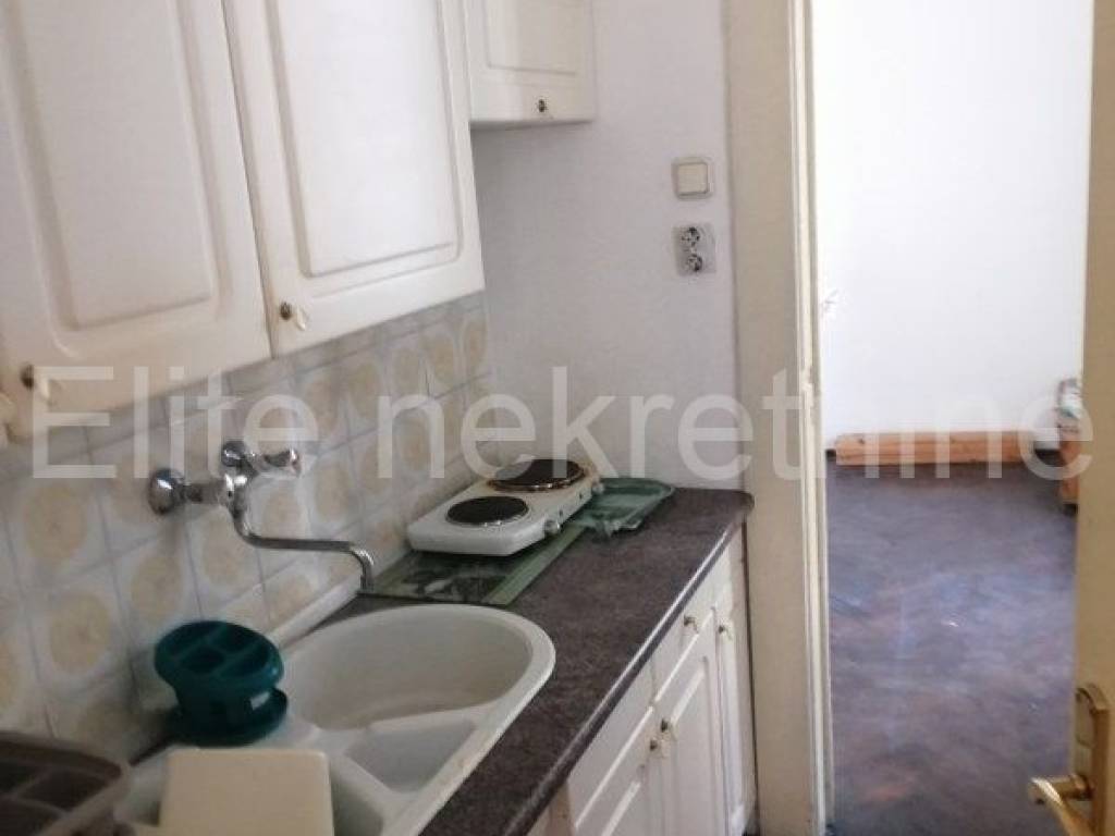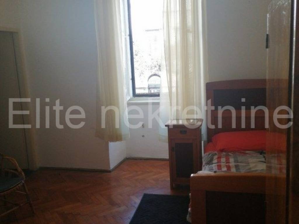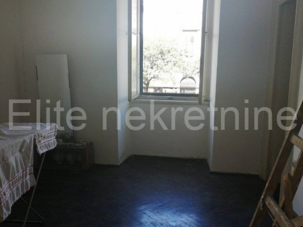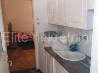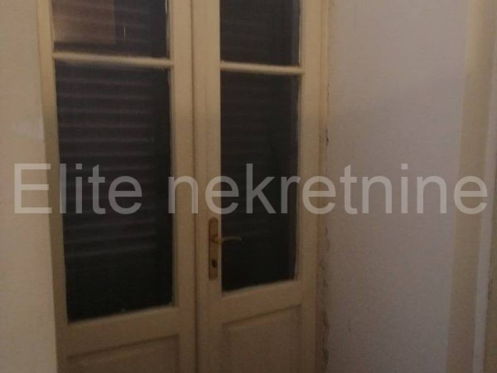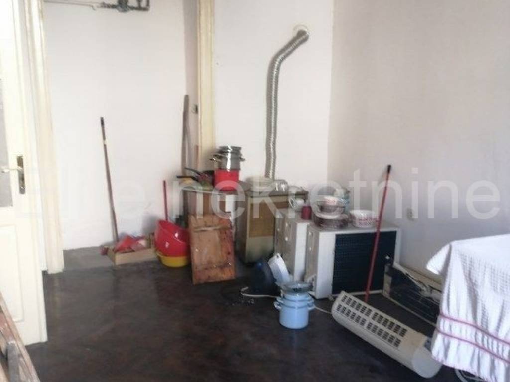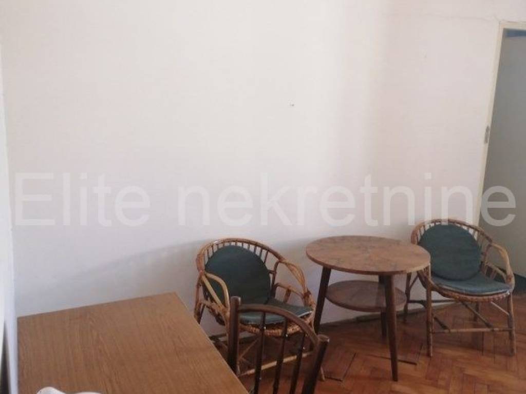 Stan se nalazi na prvom katu sjeverne i istočne orijentacije. Protuprovalna vrata i portafon. Ulazi se u mali hodnik iz kojeg vrata ravno vode u kupaonu (sa tušom i veš mašinom). Vrata lijevo vode u jednu sobu koja ima pogled na glavnu cestu. Iz te sobe druga vrata vode u manju kuhinjicu iz koje se izlazi na veliki balkon koji se proteže cijelom dužinom stana. Pogled na glavnu cestu. Druga vrata (kuhinja ima 1 balkonska i 2 sobna) vode u manju sobu s pogledom na glavnu cestu. Skroz desno vode vrata u treću najveću sobu sa dva prozora prozora koja imaju pogled na glavnu cestu. Stolarija je iznutra drvena, a izvana alu stolarija (škure). Grijanje na struju. Stan zahtjeva manju renovaciju.