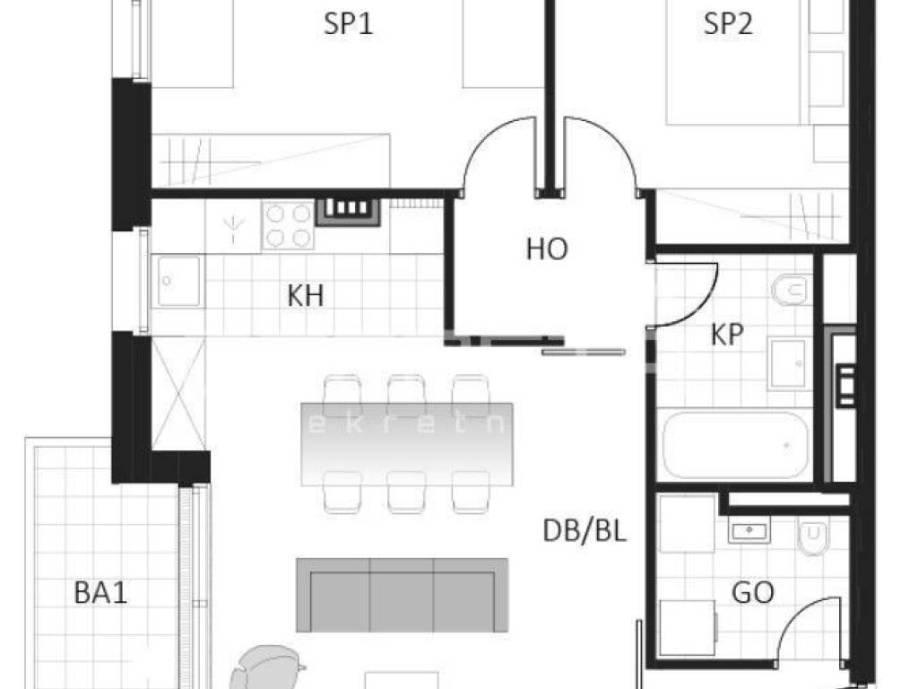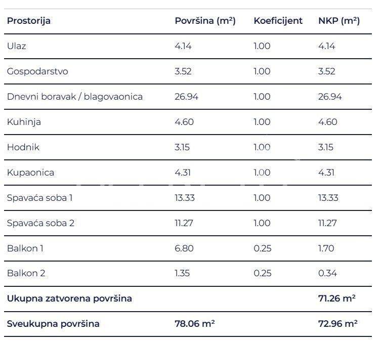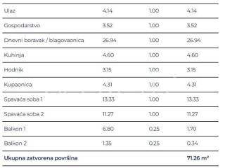 Prostrani trosobni stan sastoji se od dvije spavaće sobe od kojih jedna s balkonom, dvije kupaonice, hodnika, ostave, kuhinje s blagovaonicom i dnevnim boravkom te izlazom na veliki balkon.