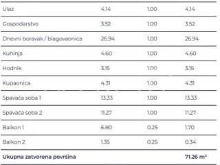 Prostrani trosobni stan sastoji se od dvije spavaće sobe od kojih jedna s balkonom, dvije kupaonice, hodnika, ostave, kuhinje s blagovaonicom i dnevnim boravkom te izlazom na veliki balkon.
