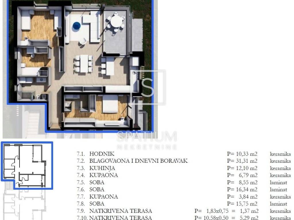 LABIN, we are pleased to present a modern and spacious apartment of 111.67 m², located on the second floor of a high-quality urban villa consisting of a total of three levels. The apartment is carefully designed to provide maximum comfort and functionality and consists of three bedrooms, two bathrooms, a hallway, and an open-concept living space that connects the kitchen, dining area, and living room with access to a covered terrace. Thanks to large glass walls, the space is filled with natural light, creating a pleasant atmosphere throughout the day. Durable and high-quality materials are used, and the project is designed to meet the highest standards of modern living. Planned construction completion is in June 2027, while handover is scheduled for December 2027.