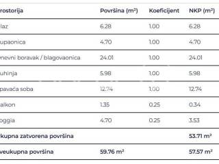 Prostrani dvosobni stan sastoji se od spavaće sobe, kupaonice, hodnika, dnevnog boravka s kuhinjom i blagovaonicom, loggie i balkona.