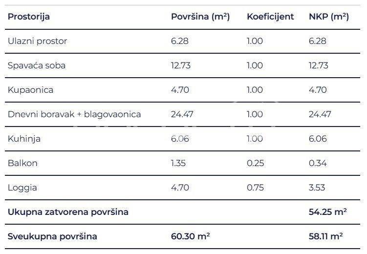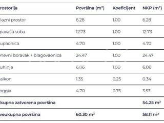 Prostrani dvosobni stan sastoji se od spavaće sobe, kupaonice, hodnika, dnevnog boravka s kuhinjom i blagovaonicom, loggie i natkrivenog balkona.