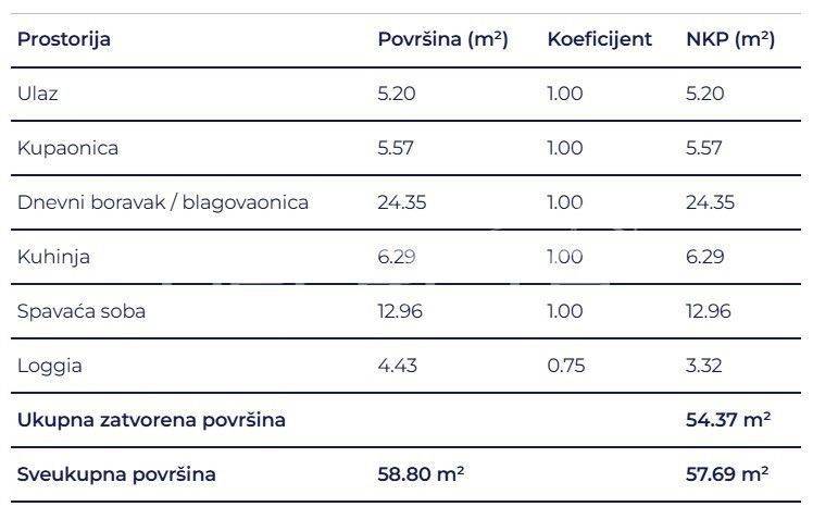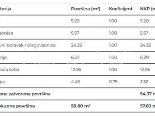 Prostrani dvosobni stan sastoji se od spavaće sobe, kupaonice, hodnika, dnevnog boravka s kuhinjom i blagovaonicom, loggie.