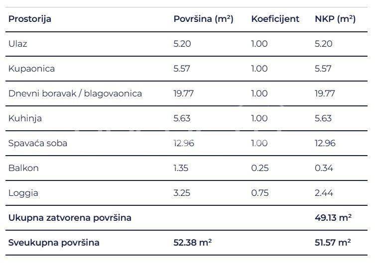 Prostrani dvosobni stan sastoji se od spavaće sobe, kupaonice, hodnika, dnevnog boravka s kuhinjom i blagovaonicom, balkona i loggie.
