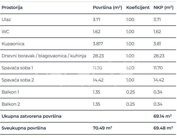 Prostrani dvosobni stan sastoji se od 2 spavaće sobe, kupaonice, wc-a, hodnika, dnevnog boravka s kuhinjom i blagovaonicom i 2 balkona.