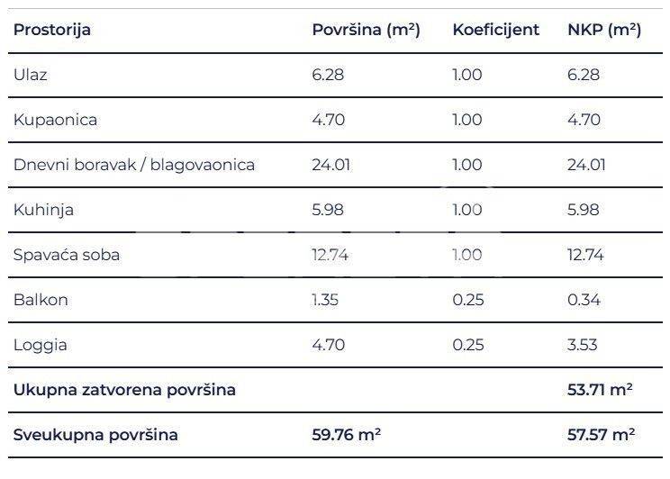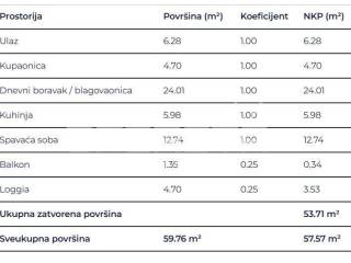 Prostrani dvosobni stan sastoji se od spavaće sobe, kupaonice, hodnika, dnevnog boravka s kuhinjom i blagovaonicom, loggie i balkona.