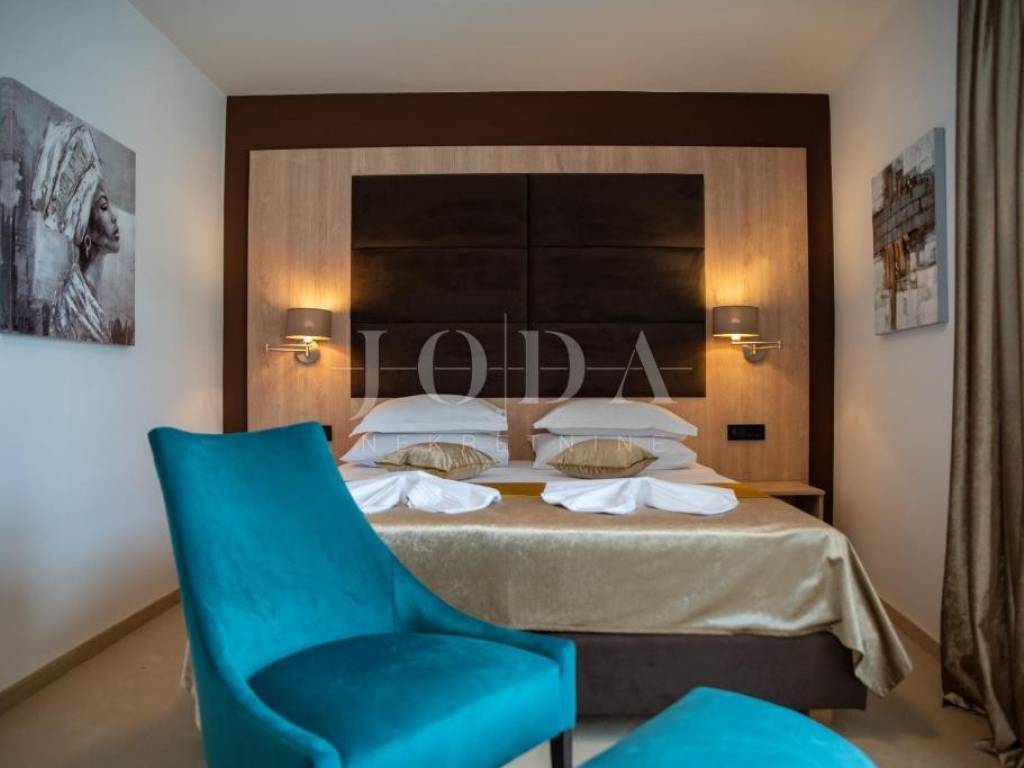 U prizemlju hotela se nalazi restoran sa terasom, kuhinja, toalet za osoblje, spremište, lift, skladište, recepcija, toalet za goste, toalet za invalide, prostorija za presvlačenje beba i prostorija za čuvanje prtljage. Na gornjim etažama nalazi se 15 soba sa kupaonicama, spremište, vešeraj, ured i terasa. Hotel je u potpunosti klimatiziran, opremljen podnim grijanjem te ima solarno grijanje tople vode. Kupaonice su opremljene kvalitetnim sanitraijama i pločicama talijanoskog proizvođača Marazzi. Namještaj u restoranu te ormarići u kupaonicama napravljeni su po mjeri. Hotel iama parking te pristup za invalide. Nekretnina za investiciju. Mogućnost kupnje disca u suterenu za 400 000.