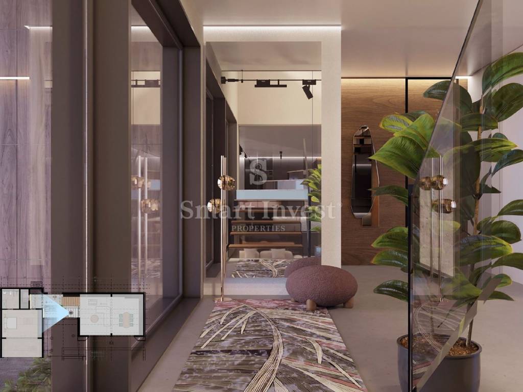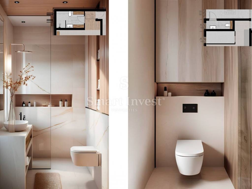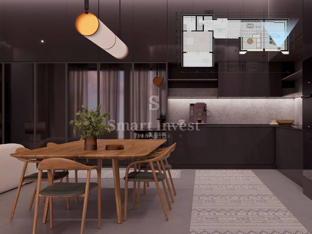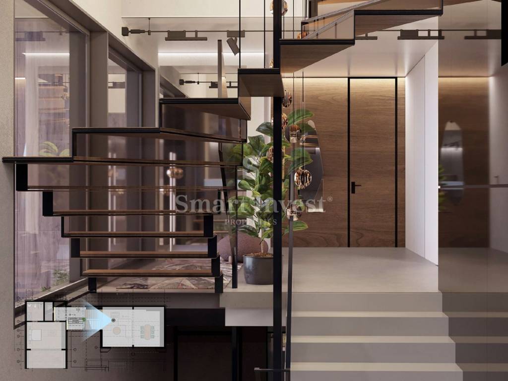 The ground floor features an elegant entrance with a cloakroom, a luxurious living room with kitchen and dining area with access to the terrace and pool, a guest toilet and a bedroom with its own bathroom and loggia.