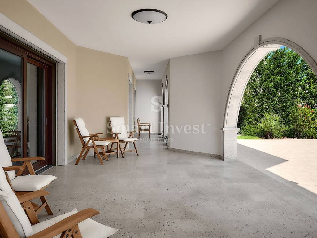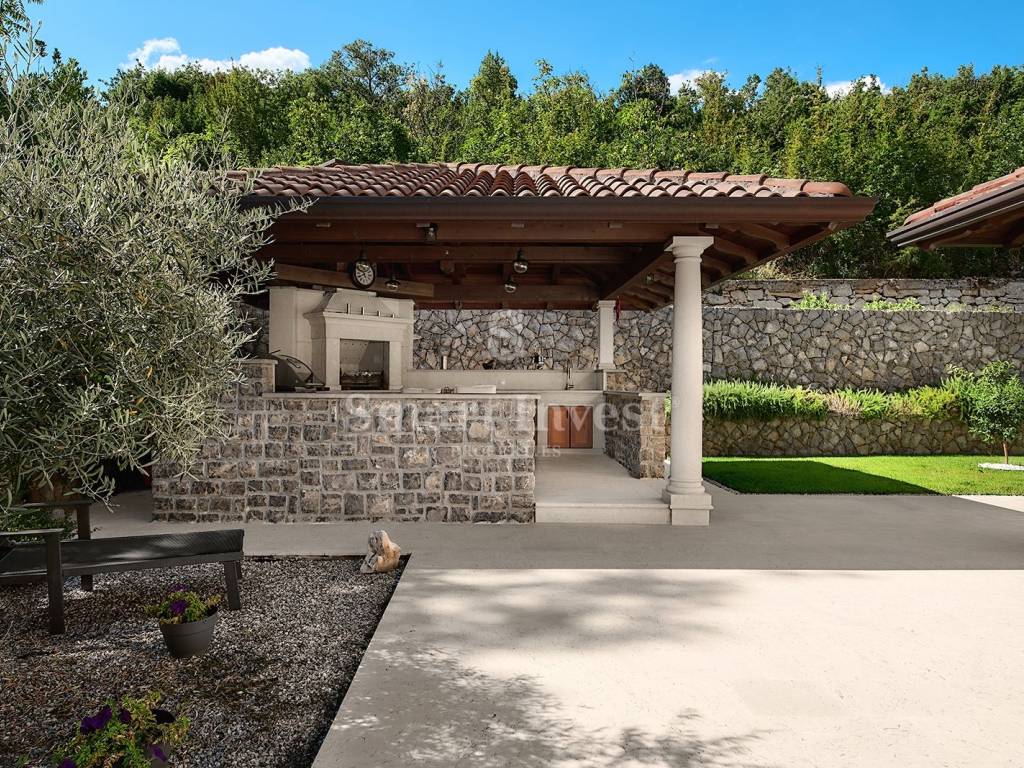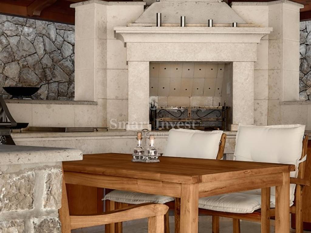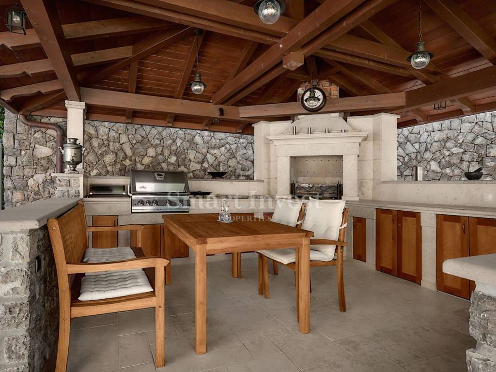 The villa's grounds are beautifully landscaped and regularly maintained. In front of the villa there is a terrace with an overflowing Infiniti swimming pool 105 meters with a spacious sunbathing area, an ideal place for relaxation and entertainment. Below the pool there is a garage for two cars, a technical room for the pool and a toilet. Behind the house there is a summer kitchen with a fireplace and a Napoleon gas barbecue.