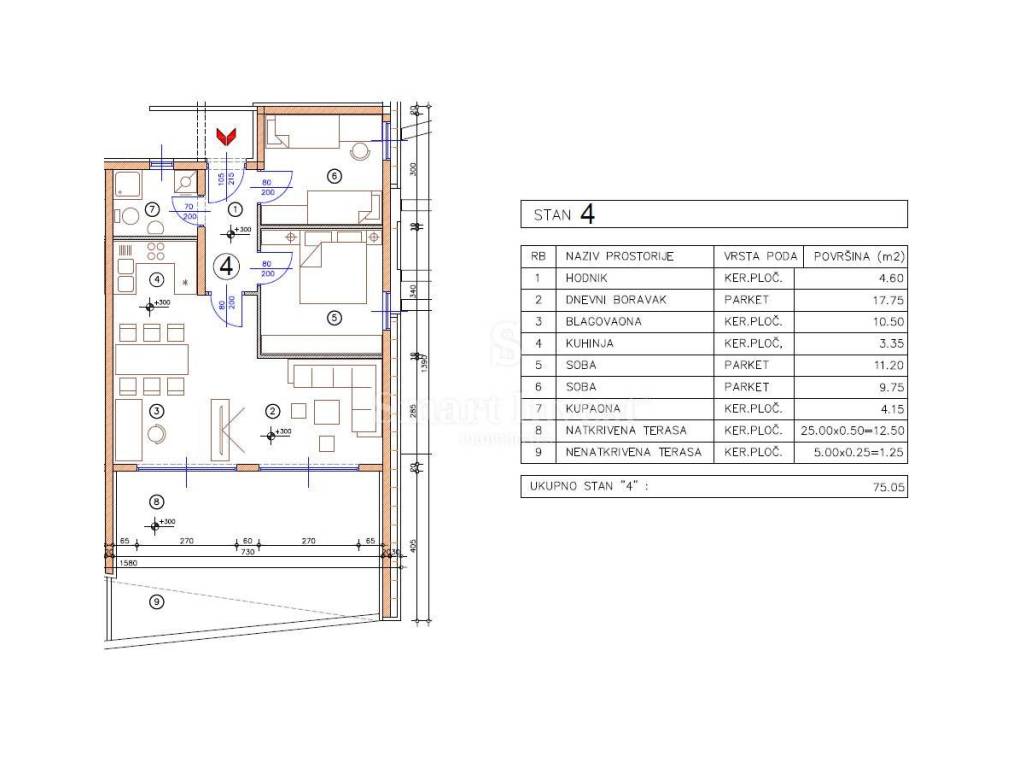 APARTMENT S4 - 2 bedrooms + living room, with a total net area of 75.05 m2 - situated on the 1st floor on the south side (from the side of the entrance - 2 floors). Consists of a corridor, living room with kitchen and dining area, 2 bedrooms, bathroom (total internal area 61.3 m2) and a covered terrace of 25 m2 and an uncovered terrace of 5 m2.