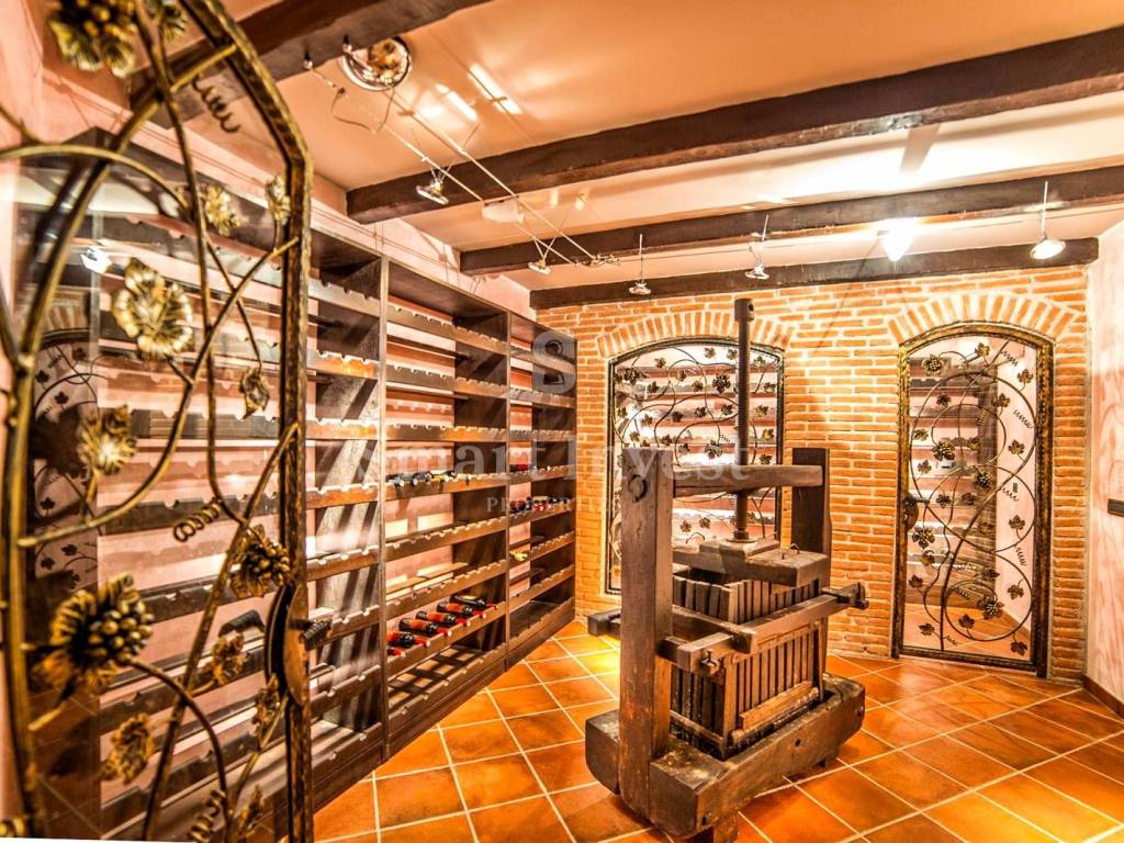 At the basement is a rustic tavern with fireplace and big space for socializing, wine cellar, bar, auxiliary kitchen and bathroom.