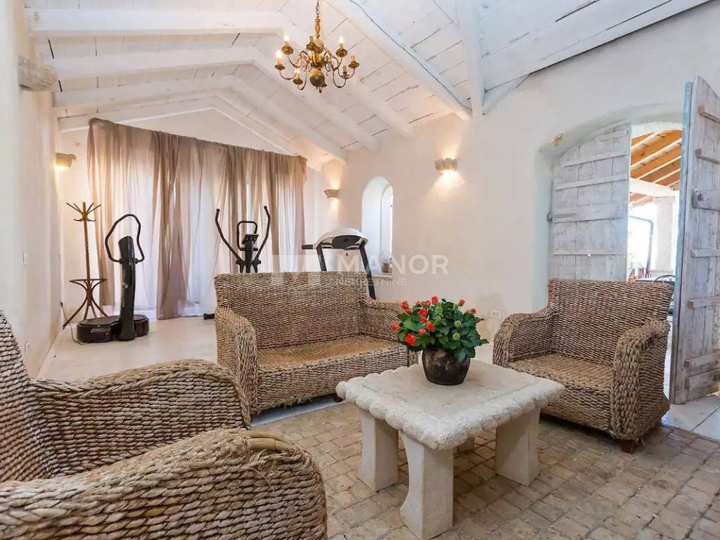 The interior is enriched with rattan furniture, handcrafted stone details, solid wood elements, and features two fireplaces.