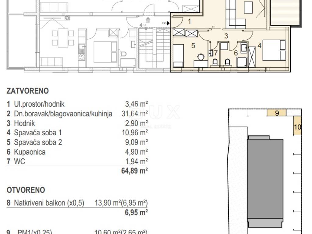 Apartment S6 is located on the first floor and consists of two bedrooms, a bathroom with underfloor heating, an additional toilet, a spacious living room with kitchen and dining area and a covered terrace with a sea view, ideal for relaxing on warm summer evenings. The apartment also has two parking spaces.