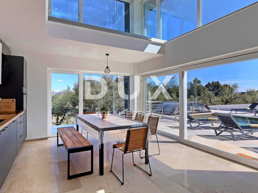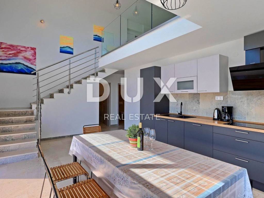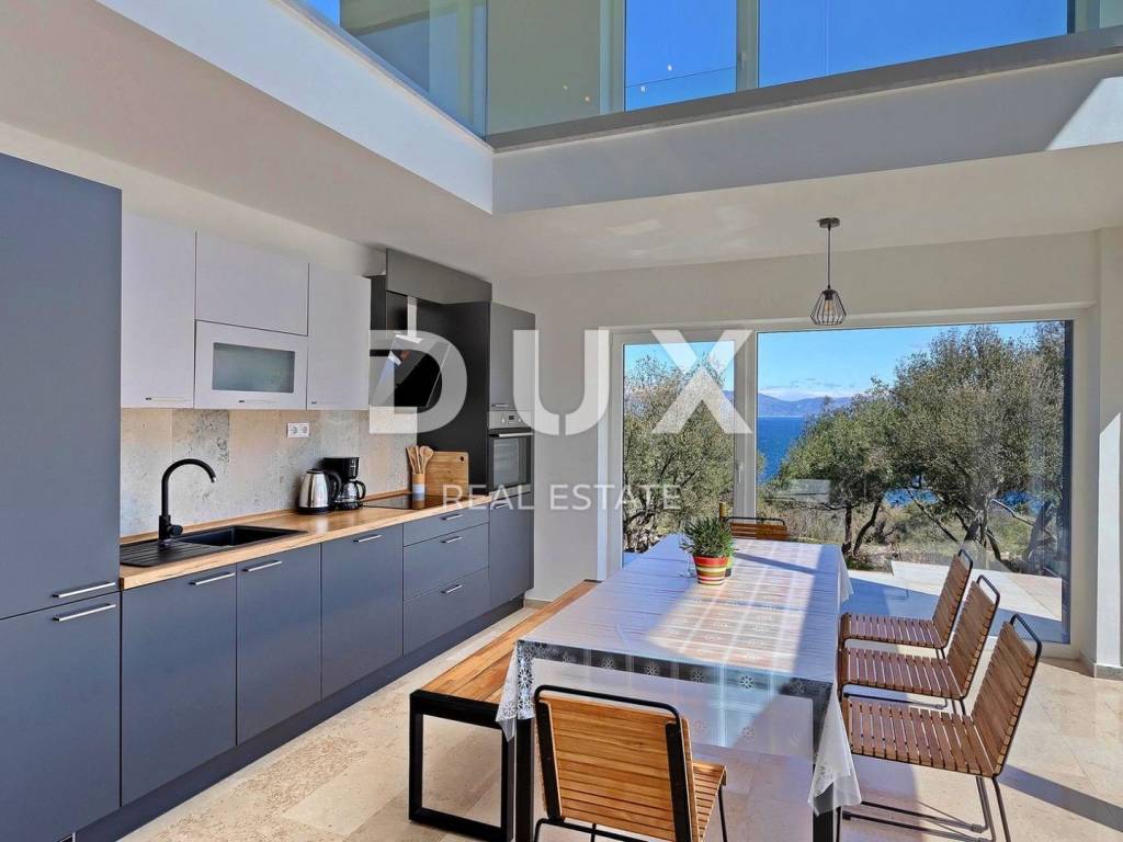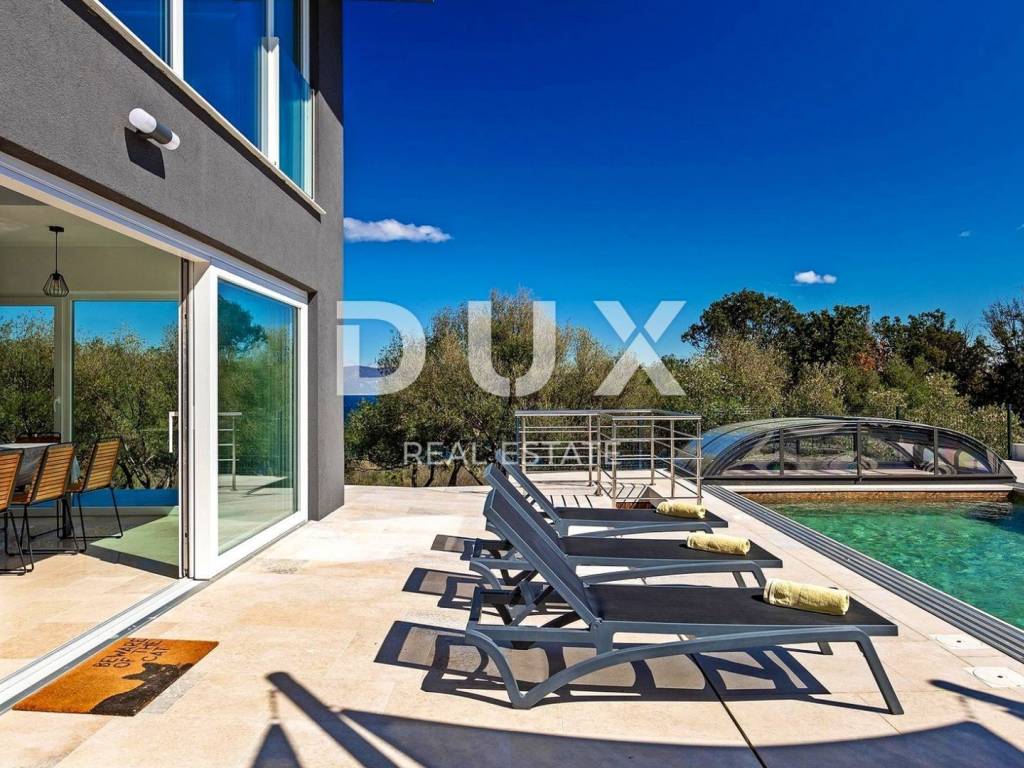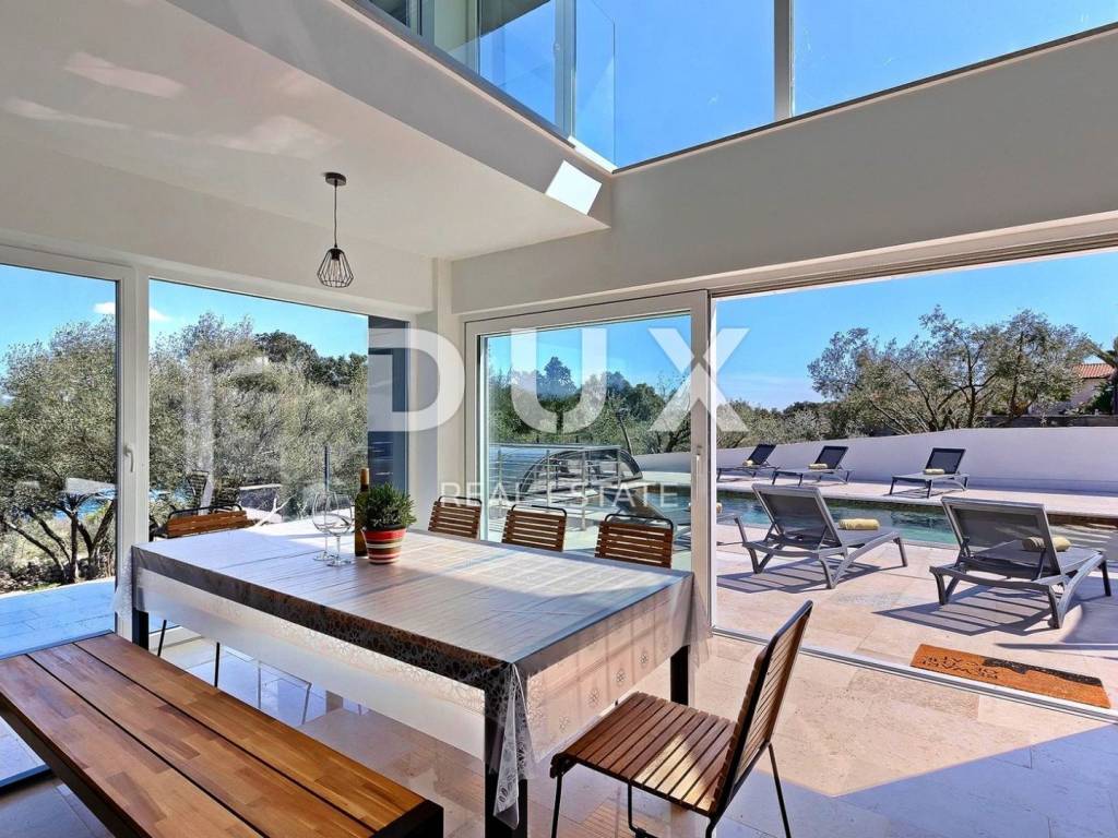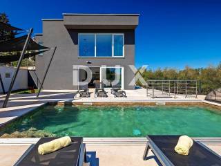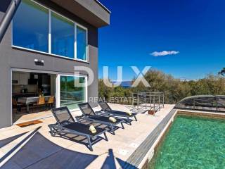On the south-eastern coast of Istria, where green hills meet the sea, where nature and heritage come together, there are two towns of similar size with different but mutually complementary characters - Labin and Rabac, just four kilometers apart. Rabac, due to its white pebble beaches, rich Mediterranean vegetation and crystal clear sea, has been called the pearl of Kvarner. Once a small fishing village, today Rabac is an attractive tourist destination that hides a wealth of cultural events in a network of colorful streets. The green surroundings of Rabac and the picturesque hinterland invite you to adventure, research and recreation throughout the year. Not far from Rabac and Labin in a small settlement by the sea, a villa with a panoramic sea view is for sale. It is located in a quiet neighborhood with a view that includes Učka, the city of Rijeka, the Kvarner islands and the crystal clear Adriatic Sea, and the position of this property offers exactly that enchanting and unique view. It is characterized by a modern design, and in its construction, top quality building materials were used according to the highest standards for residential construction. The minimalist modern interior has an emphasis on open space with glass walls that allow lots of natural light and a panoramic view of the sea. It is defined as one residential unit whose area is distributed over two floors; ground floor and first floor. The ground floor consists of a kitchen with a dining room, three bedrooms, three bathrooms and a guest toilet. On the first floor there is a spacious living room, a bedroom, a bathroom and a guest toilet. The yard is landscaped and horticulturally landscaped and fenced, and the complete harmony is provided by a heated pool of 38 m with a sunbathing area. The location, structure and comfort make this property an ideal opportunity for a peaceful family life as well as an investment for the purpose of tourist rental.