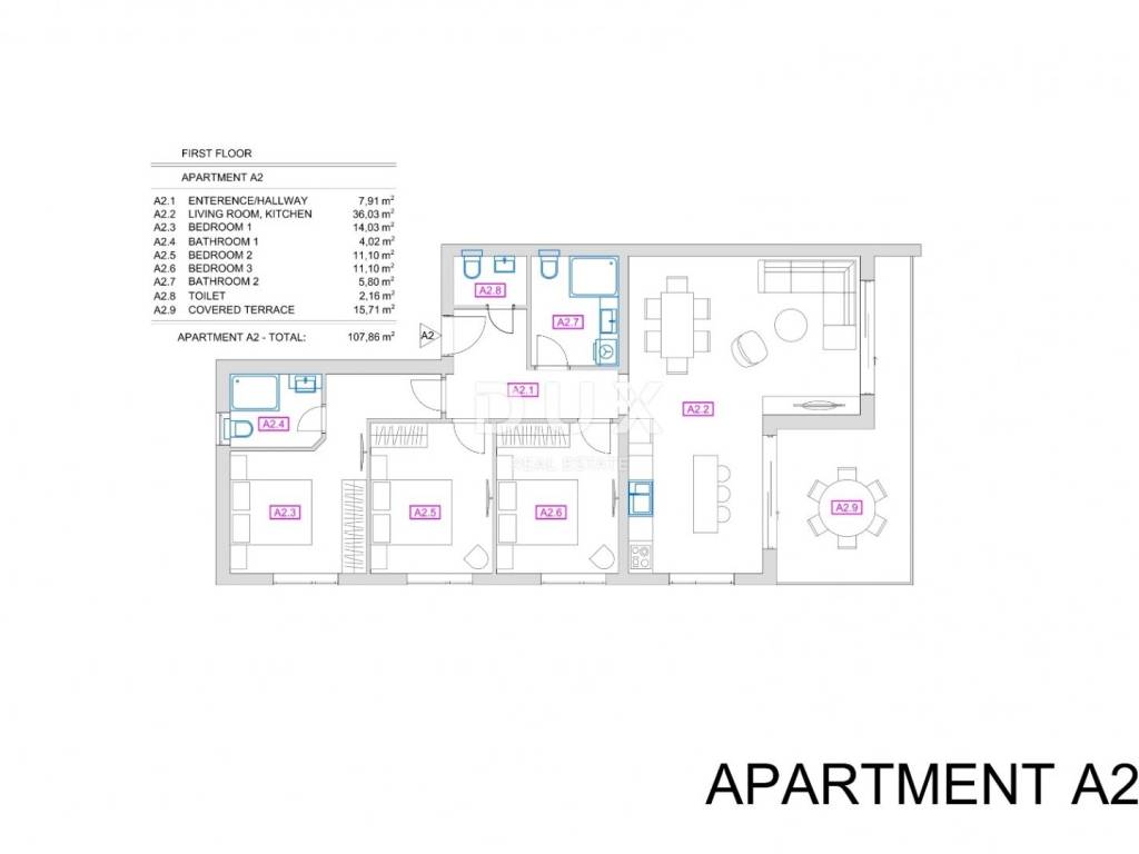 We present a modern new building in Vrbnik with six residential units, on the edge of the green belt! - High quality construction and equipment. We highlight electric underfloor heating with Wi-Fi control (living room, bathroom and toilet), Daikin air conditioners in the bedrooms and living room, a 180200 L boiler, wood-patterned ceramics, PVC exterior joinery, interior wooden doors with hidden hinges and magnetic locking, and a video surveillance system. - Building in a quiet location with lots of privacy and a beautiful view, only 350 meters from the sea! We highlight for you: Apartment on the 1st floor with terrace - area 108 m2 - 3 bedrooms (11 m2 - 14 m2) - 2 bathrooms and 1 toilet - open space kitchen with dining room and living room - 36 m2 - covered terrace of 16 m2 - sea view - 2 parking spaces Completion of construction is planned for summer 2026. Excellent opportunity for private enjoyment or investment in tourist rental!