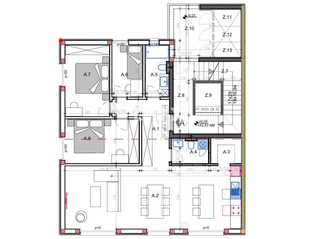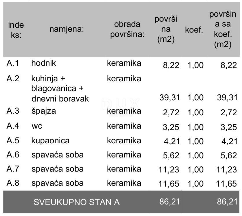 LOCATION DESCRIPTION: Veli Vrh is one of the most desirable neighborhoods in the city of Pula. Given that this neighborhood is home to some of the best schools and kindergartens, and given the excellent connections to the city center and the beautiful beaches in nearby Štinjan and Fažana, this is exactly what makes Veli Vrh a location of interest. Right on Veli Vrh, slightly set back from the main road, is this beautiful modern building. PROPERTY DESCRIPTION: A new, modern building with its own underground garage and elevator is starting construction and is looking for its new tenants and owners. The building consists of 4 residential units, each of which is equipped with underfloor heating with a heat pump, inverter air conditioners in each room of the apartment, a combination of ceramics and parquet as floor coverings, electric shutters and mosquito nets on all windows, and an excellent layout of the rooms and the floor plan itself that provides comfort and a pleasant stay. APARTMENT DESCRIPTION: Building A, apartment A. Ground floor apartment with a yard! The apartment consists of an entrance hall, living room with kitchen and dining room, three bedrooms, bathroom, toilet and storage room, with a total area of 86.21 m2. The apartment also has a 60 m2 yard, storage room and two parking spaces in the underground garage (no. 1 and 2). With all other accessories that we calculate according to the given coefficients, we arrive at a total area of 111.82 m2. For all additional information about the property and arrangements for viewing it, call your agent!