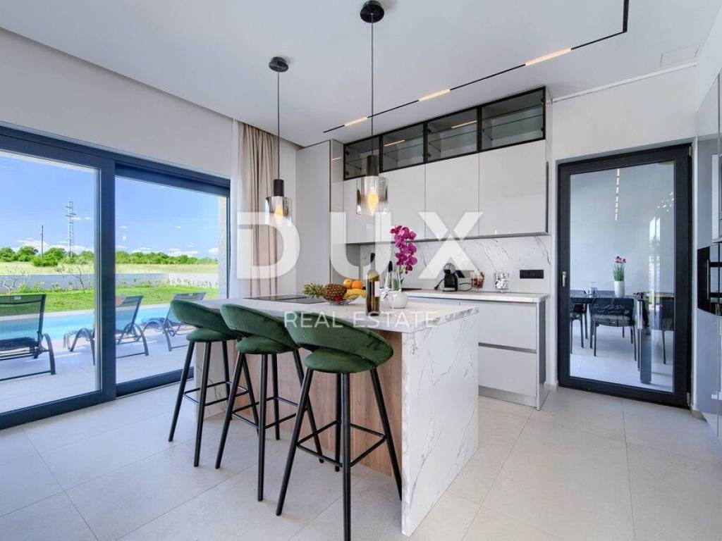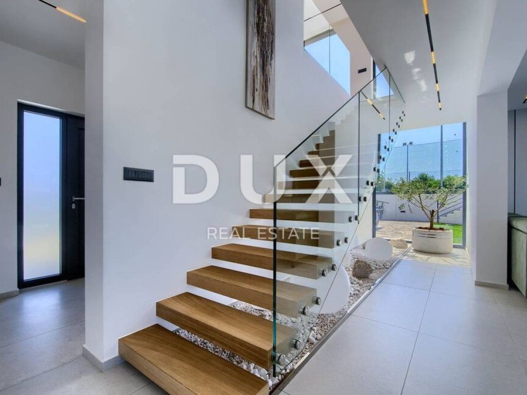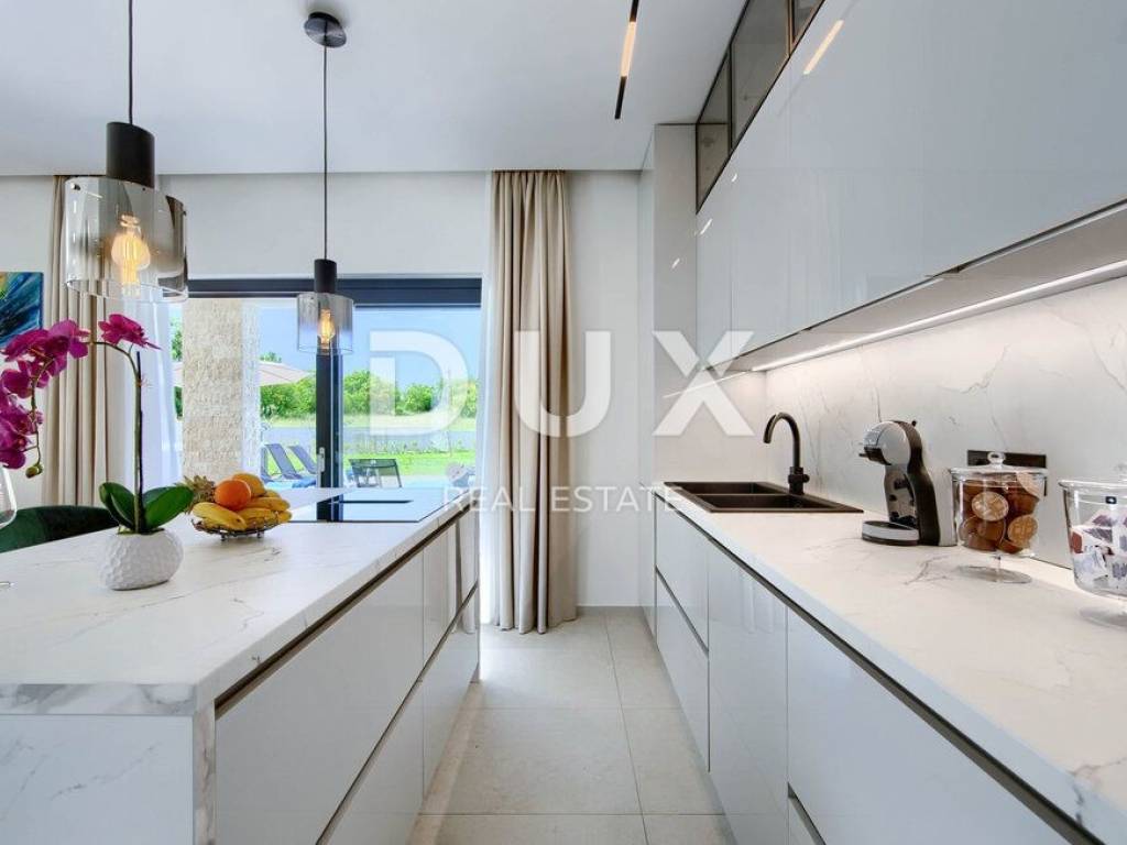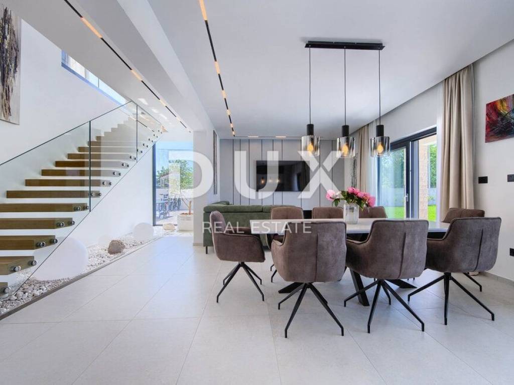 On the southeastern coast of Istria, where green hills meet the sea, where nature and heritage unite, there are two towns of similar size with different but complementary characters - Labin and Rabac. The picturesque town of Labin rises on a 320-meter-high hill just four kilometers from the white pebble beaches of Rabac. Interwoven with a rich history and mining that marked this area, Labin, which was briefly declared an independent republic, is today a fascinating city of contradictions; old and new, history and present, tourism and art. Not far from the town of Labin, an immaculate house with a swimming pool is for sale. The property offers peace and privacy. It is located in a quiet village far enough away from the hustle and bustle and yet close to the center of the village, which contains all the amenities needed for a year-round stay, while offering the perfect balance of rural surroundings and proximity to the sea and urban amenities. Perfectly integrated into the surrounding landscape, in addition to its convenient location and quality of construction, the property is characterized by a harmony of needs, space, function, construction and beauty. An attractive and harmonious interior and harmoniously planned rooms equipped with quality appliances and furnished with high-quality custom-made furniture show that every detail was thought of when designing this house. It is designed as a single residential unit spanning two floors. The ground floor consists of an open-concept space that unites the living room, dining room and kitchen with access to a covered terrace containing a summer kitchen, guest toilet, laundry room and storage room. The first floor consists of three bedrooms with private bathrooms, a hallway and a terrace. The spacious garden is elegantly decorated, fully fenced and equipped with an automatic irrigation system, and the perfect harmony is provided by a swimming pool with a sundeck and a tennis court. The excellent spatial organization of the interior and exterior, the amenities, the quality and the location of this property provide an opportunity for a comfortable family life or an investment in a tourist rental business.