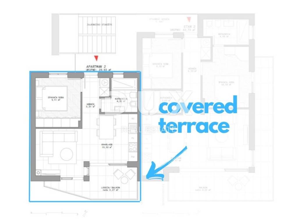 Exclusively, only in our offer, DUX presents a fantastic opportunity to purchase a new building in Opatija with optimal square footage. Apartment A2 consists of a hallway, bedroom, bathroom and a living room connected to the kitchen, dining room and terrace.