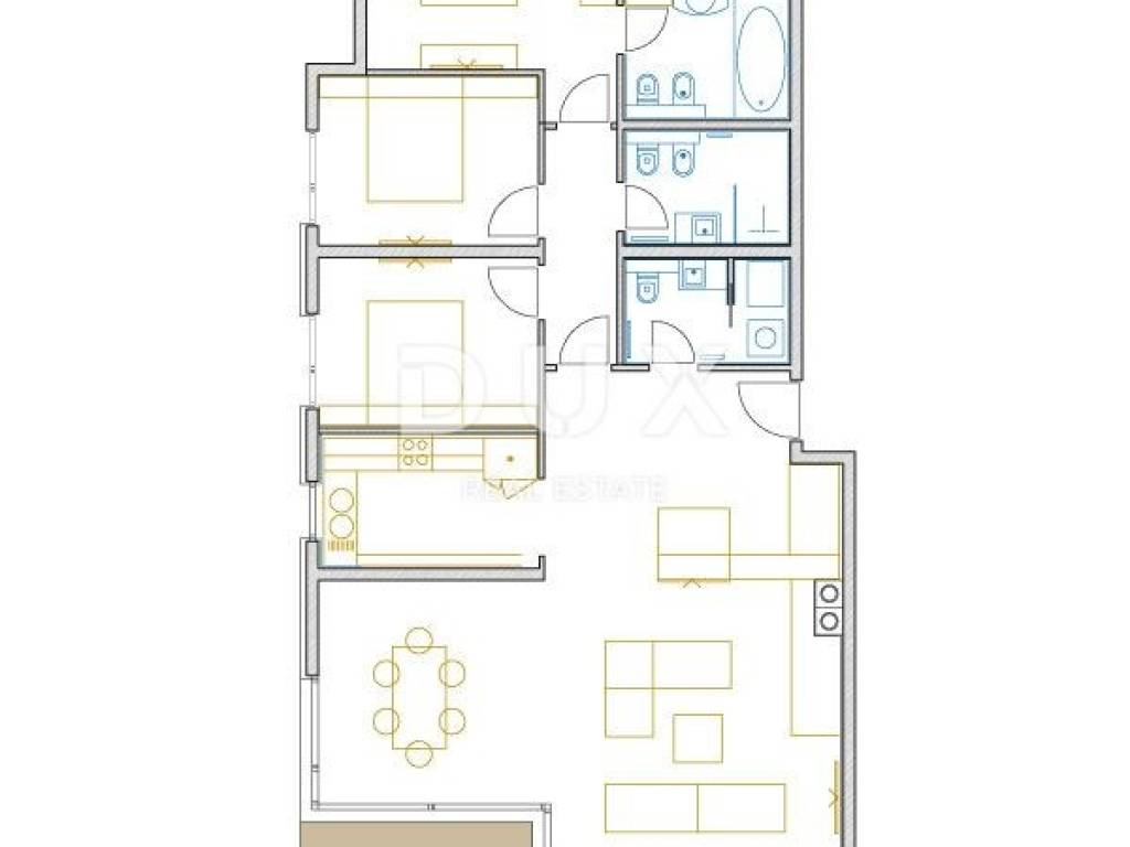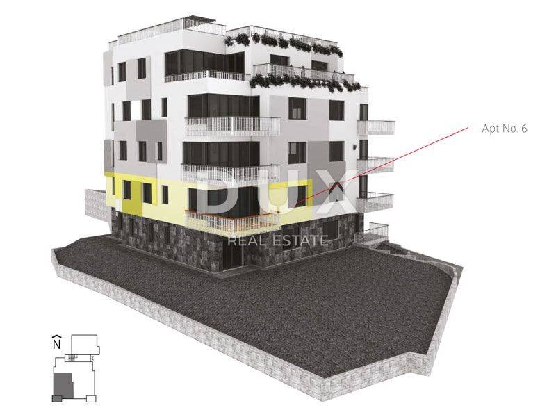 DUX presents a great opportunity to purchase a new apartment with a terrace in the center of Opatija. The apartment is located on the 1st floor of a new building and includes two parking spaces in the garage. The apartment has a size of 139m with coefficients and consists of a hallway, open-space living room with kitchen, four bedrooms, and two bathrooms. It also features a sunny loggia (balcony) with a neat view and a storage room in the basement.