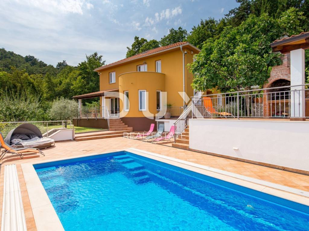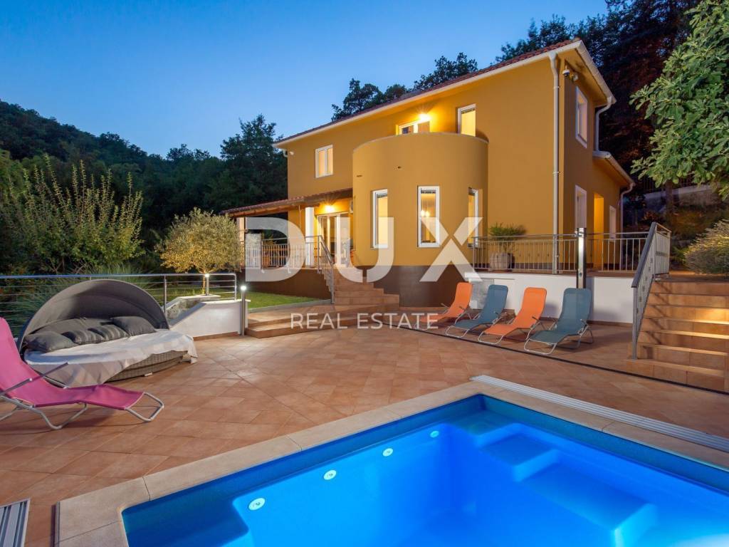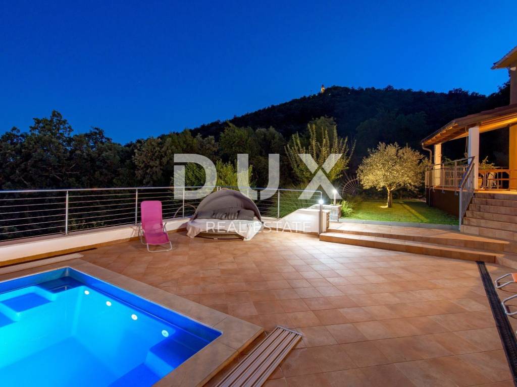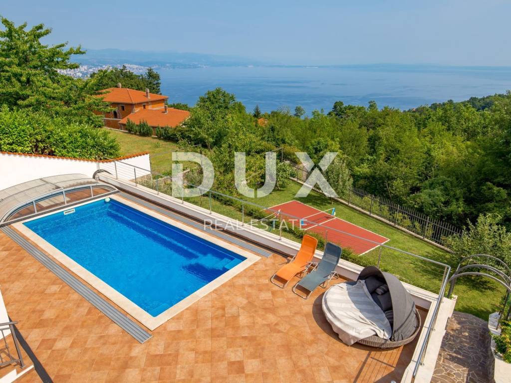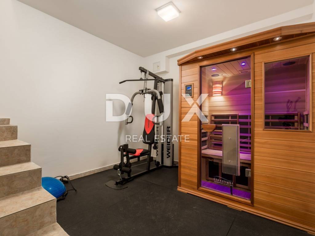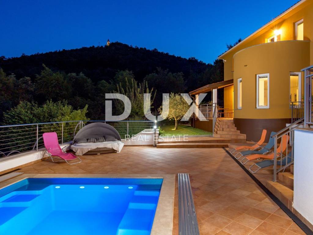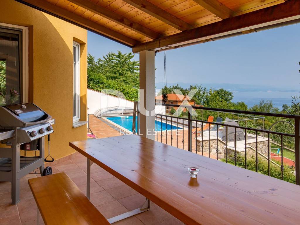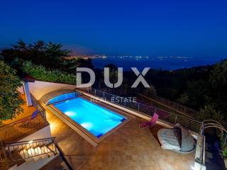 In a quiet location surrounded by forest and greenery, we offer for long-term rent a furnished and decorated house with an area of 200 m2. On the ground floor there is a living room with access to the terrace and garden, a dining room with a kitchen, a bedroom, a bathroom, a toilet and a study. On the first floor there are 4 bedrooms, a bathroom, 2 storage rooms and a terrace, while in the basement there is a sauna and a boiler room. All rooms are air-conditioned, there is underfloor heating in the bathrooms and living room, video surveillance and an alarm system. The house is equipped with a large part of solid wood furniture. The large garden with a lot of Mediterranean and other plants is completed with facilities such as a covered heated pool, a sunbathing area, a barbecue with a gazebo, a badminton and tennis court. Automatic irrigation system for all green areas. The beautiful environment with a wonderful view of the sea is a great opportunity for those looking for peace and quiet.