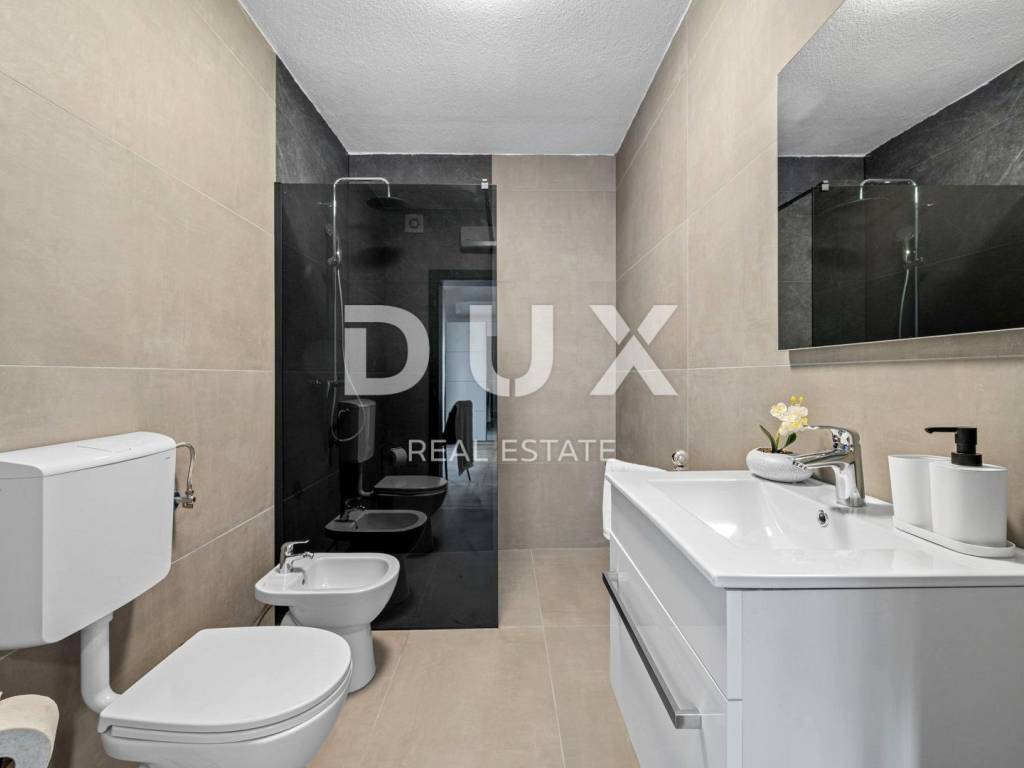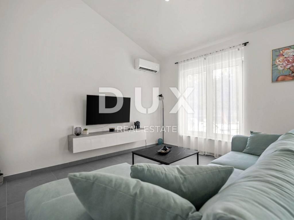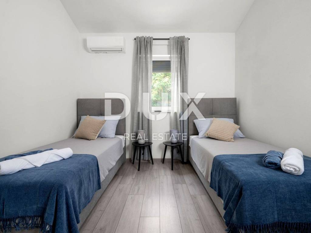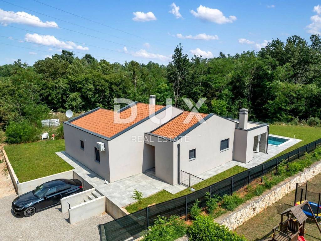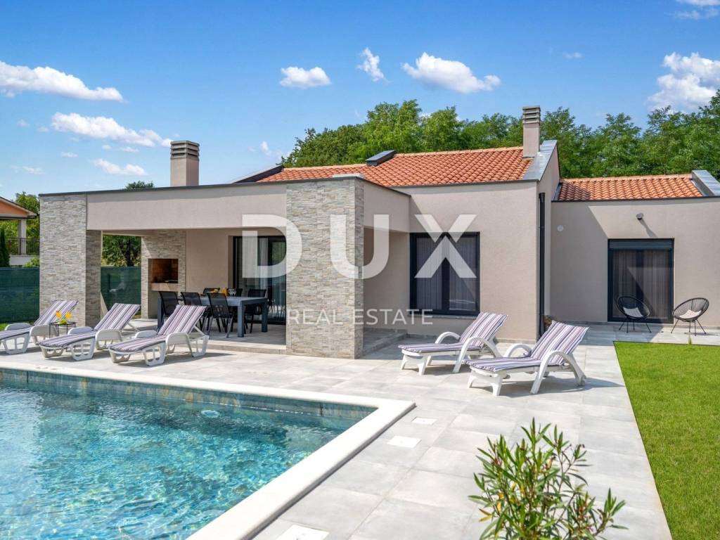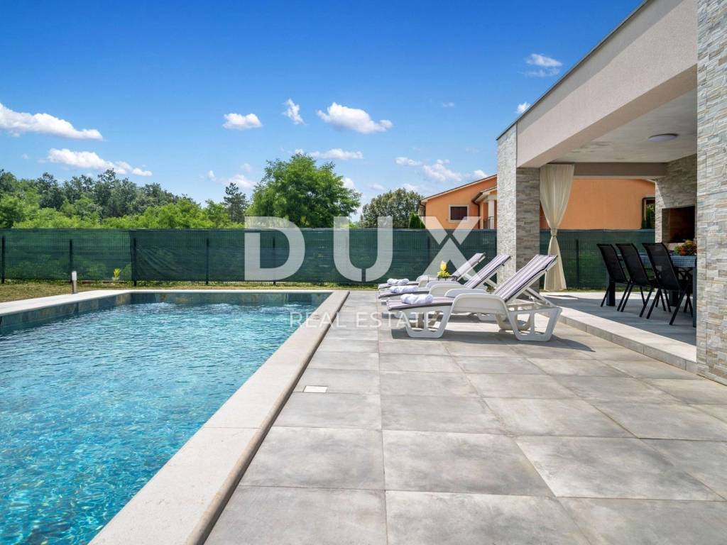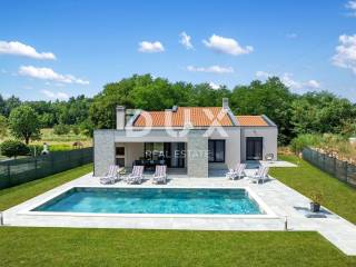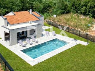 On the southeastern coast of Istria, where green hills meet the sea, where nature and heritage meet, there are two towns of similar size but with different but mutually complementary characters - Labin and Rabac. The picturesque town of Labin rises on a hill 320 meters high, only five kilometers from the white pebble beaches in Rabac. Intertwined with rich history and mining that marked this region, Labin, which was declared an independent republic for a short time, is today a fascinating city of contradictions; old and new, history and present, tourism and art. Surrounded by greenery on the edge of a quiet village near the town of Labin, a house with a swimming pool is for sale. In addition to the microlocation, the property is characterized by the quality of the construction, which guarantees long-term satisfaction and quality of housing. The house of timeless design blends in shape and color with the village and the landscape. It was conceived as one residential unit that extends through one tastefully decorated and well-equipped floor that exudes elegance. It consists of an open concept space that unites the kitchen, dining room and living room with access to a covered terrace with an open fireplace. The floor plan is complemented by three bedrooms, three bathrooms and a storage room. The yard is completely fenced and landscaped and horticulturally arranged, and complete harmony and harmony is provided by the swimming pool with sunbathing area. The excellent location and the spatial organization of the interior and exterior of this property provide an opportunity for a comfortable family life or an investment in a tourism rental business. Dear clients, the agency commission is charged in accordance with the General Business Conditions: www.dux-nekretnine.hr/opci-uvjeti-poslovanja