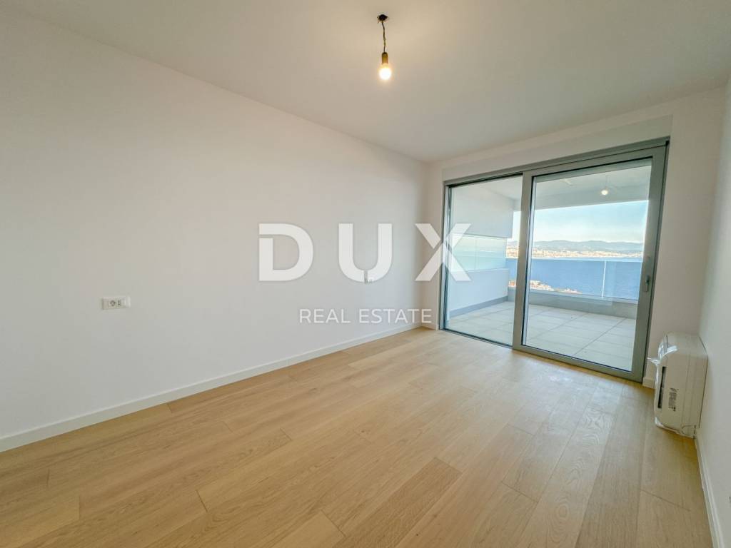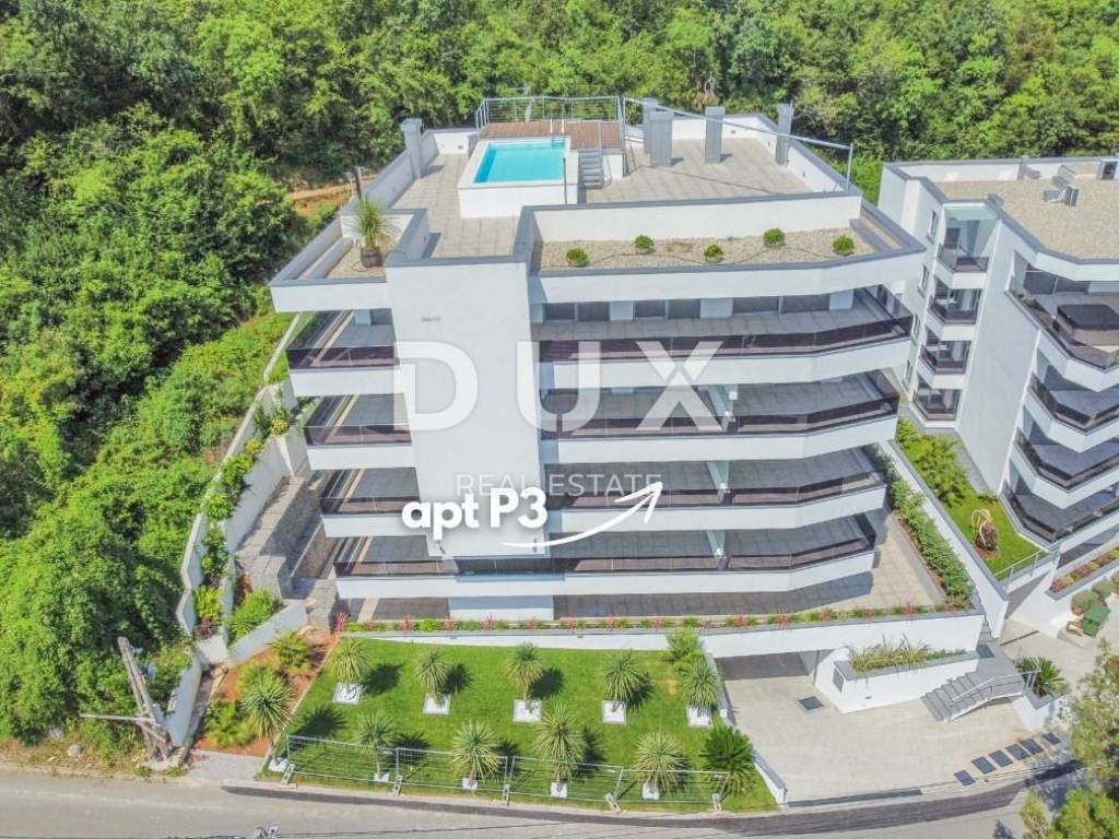 We are mediating the sale of a beautiful modern apartment P3 with an area of 92.14 m2 above the center of Opatija with a panoramic view of the sea, a balcony, a swimming pool, an elevator and two parking spaces. This modern and exclusive property stands out for its southern orientation with beautiful views, sliding glass walls that allow an unobstructed view and lots of light throughout the year. The apartment consists of two bedrooms, two bathrooms and one toilet, and the beautiful open space living room is connected to the dining room and the kitchen, and the entire space offers access to the terrace, where you can enjoy the beautiful view of the blue sea. We highlight: - fantastic SCHUCO aluminum carpentry - first-class parquet - electric blinds - top sanitary ware - Italian ceramics - burglar-proof entrance door - elevator - shared pool - energy-efficient construction and insulation The apartment has access to the shared pool, and also has an elevator and two parking spaces places, one of which is in the garage, and the other is uncovered. The location of the apartment is fantastic: a quiet and peaceful street above the very center of Opatija, close to the beach and the Lungomare promenade. You can walk to the beach in just 8 minutes, and it really only takes one minute to drive. It is important to point out that the building is surrounded by green forest. It is a perfect opportunity to buy a fantastic property in one of the most beautiful cities on the Adriatic. Ideal both for living, as well as for tourist rental or investment.