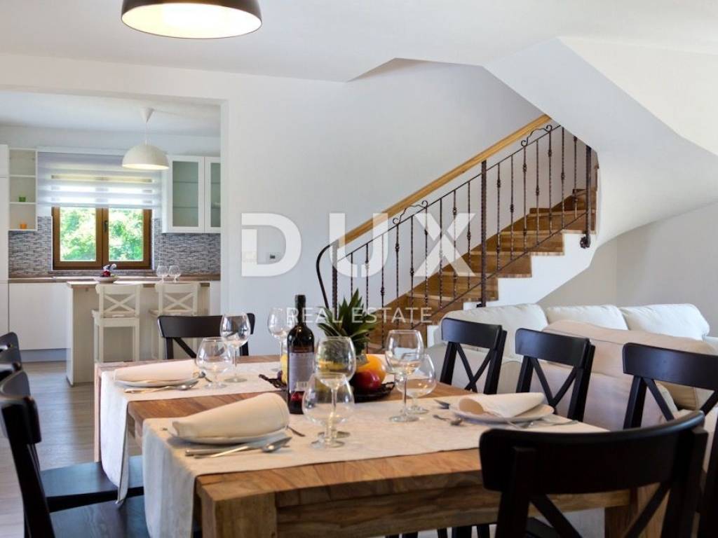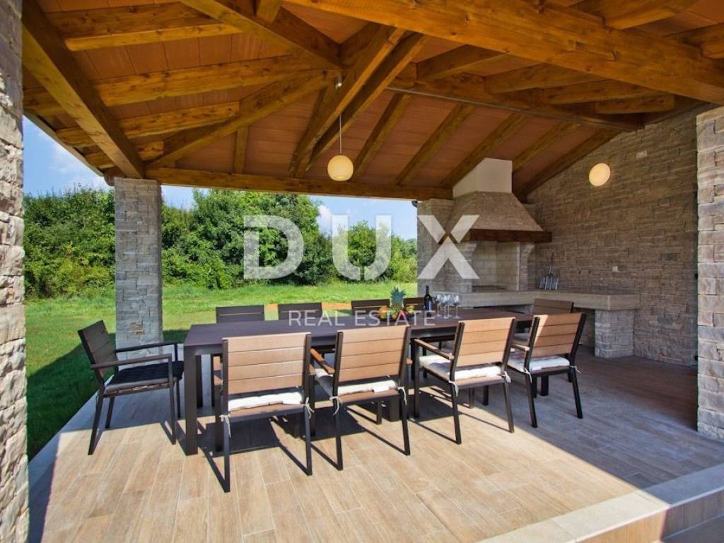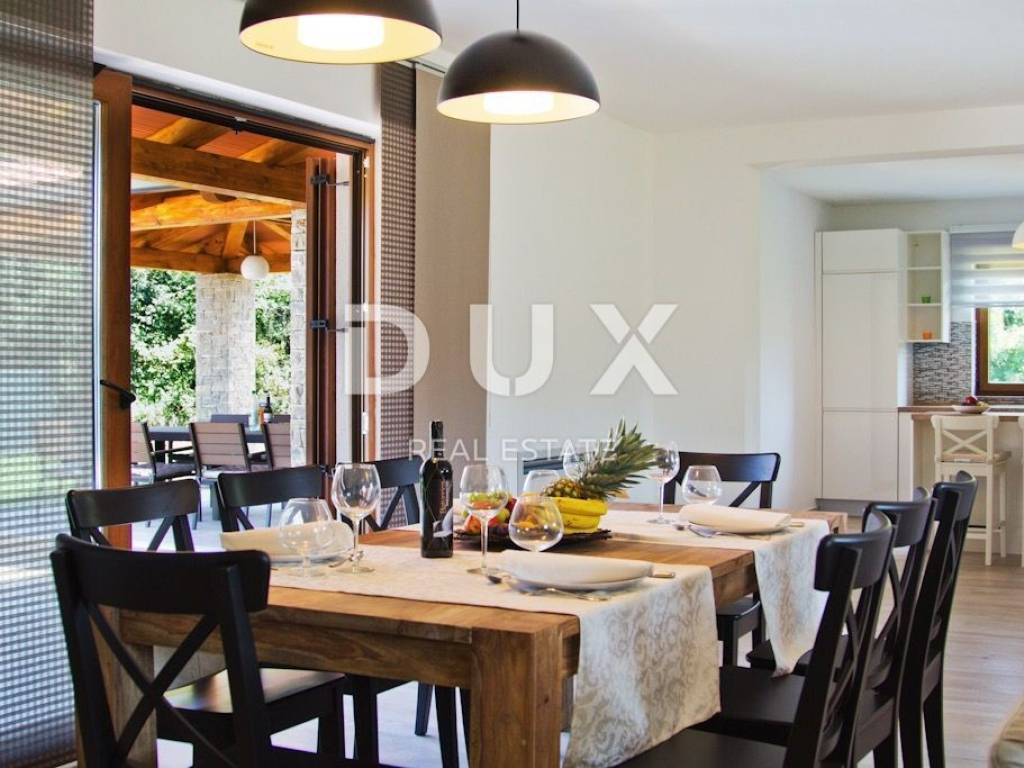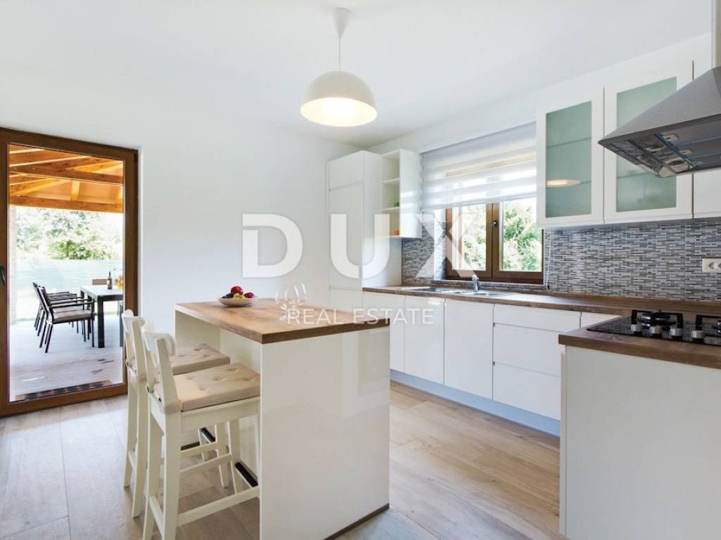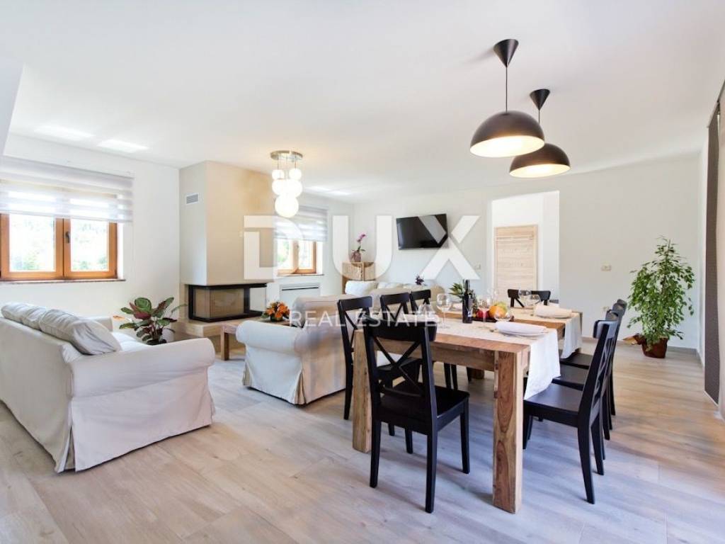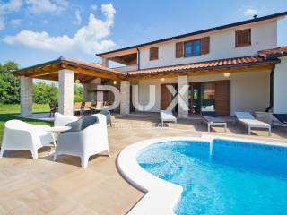 On a hill above the tourist town of Rabac is the medieval town of Labin, whose old name Albona was first mentioned in 285 AD. Today, it is a cultural and administrative center where the wealth of architecture and cultural and historical monuments is rarely combined so charmingly with numerous art studios and the breath of youth that gathers there, especially in the evening, in numerous cafes. In the eastern part of central Istria, on a high plateau above the Raša river valley and in the hinterland of the town of Labin, lies Sveta Nedelja. The special location, the proximity to the sea, but also to lush forests, means a holistic combination of green and blue. This area is full of architectural remains that will tell you the story of the long and interesting history of this area and awaken in you the desire to explore and discover why the rich from ancient times chose this very area as the place to build their country estates. This beautiful villa is located at a distance of about 9 km from the center of Labin, surrounded by vineyards and beautiful nature in a quiet and smaller settlement. It is located about 13 km from the famous tourist town of Rabac, with beautiful beaches, walks, nature, and a rich tourist offer. Istria, Labin - A beautiful villa with a pool in a green environment, 210 m2, consists of two floors. On the open ground floor, you can prepare homemade meals in a modern and fully equipped kitchen with a dining area or relax in a beautiful living room with a fireplace. On the ground floor there are also 2 bedrooms (ensuite) with their own bathrooms, as well as a separate toilet and storage room. A beautiful internal staircase leads to the upper floor, where there are two bedrooms each with a bathroom, a large covered balcony with a beautiful view of the green landscape, from which there are entrances to the home gym with a toilet. The living room opens onto a beautiful partially covered terrace. There is an outdoor grill in the covered part of the terrace. The BBQ area is bordered by a traditional dry wall with hand-hewn stone, and the terrace is connected to a landscaped beach with a 32 m2 swimming pool. The yard is bordered by a maintained green fence. Two covered parking spaces are planned. This beautiful villa is surrounded by vineyards and green meadows which offers an additional sense of peace and privacy. On the garden of 1160 m2 next to the pool and bbq area with garden furniture with enough space for a large family and friends, there is also a children's corner with a trampoline. A well-maintained yard with a lawn completes the impression of this excellent property. During the construction of this villa, special attention was paid to the details and the materials used. Heating and cooling is via a fan cooler and a heat pump, and there is a fireplace in the living room for a more special atmosphere during the winter months. This property offers you the opportunity to escape from the city lifestyle in a quiet and safe location surrounded by greenery and untouched nature. Apart from the fact that the villa is ideal as a family oasis, it is also interesting as a villa option for tourist rental.