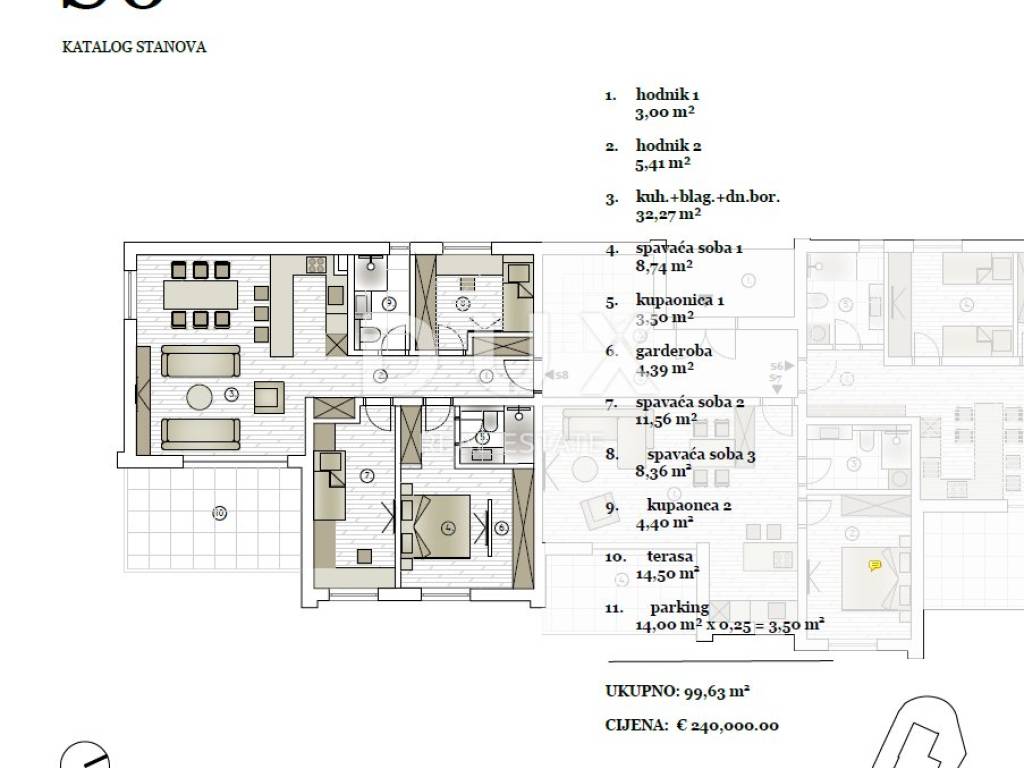 Apartment for sale in Vodice, near Šibenik. The apartment of 99.63 m2 is located on the second floor of a modern building with a total of two floors, which stands out for its contemporary design and high-quality construction. This spacious apartment offers a comfortable and functional space, perfect for living. The entrance to the apartment leads to a spacious hallway, which elegantly connects three spacious bedrooms and one bathroom, and one of the rooms has its own bathroom, providing additional privacy. The kitchen, dining room and living room are located together, creating a spacious and bright open space that is ideal for socializing. Large glass surfaces provide plenty of natural light, and you can directly access the terrace from the living room. The apartment also has one parking space, which is a practical solution for parking vehicles. In addition, owners can enjoy a part of the garden that provides additional space for relaxation and recreation. This modern building consists of seven apartments and two suites, emphasizing the exclusivity and intimacy of the community. High-quality construction guarantees a long-lasting, high-quality home. This newly built apartment offers a perfect combination of comfort, functionality and aesthetics, providing its owners with a high level of quality of life. The islet of Prvić is located near the town of Vodice, and the center of Šibenik is 12 km away. The city of Split is 69 km away, and the nearest airport is 49 km away. There are several National Parks and Nature Parks in the area. Kornati National Park, also known as the pearl of the Adriatic, is located in the immediate vicinity of Šibenik. A little further north is the Vrana Lake Nature Park, a natural ornithological reserve with rich flora and fauna. Dear clients, the agency commission is charged in accordance with the General Business Conditions www.dux-nekretnine.hr/opci-uvjeti-poslovanja.