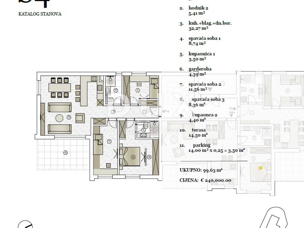 Apartment for sale in Vodice, near Šibenik. The apartment of 99.63 m2 is located on the first floor of a modern building with a total of two floors, which stands out for its contemporary design and high-quality construction. This spacious apartment offers a comfortable and functional space, perfect for living. The entrance to the apartment leads to a spacious hallway, which elegantly connects three spacious bedrooms and one bathroom, and one of the rooms has its own bathroom, providing additional privacy. The kitchen, dining room and living room are located together, creating a spacious and bright open space that is ideal for socializing. Large glass surfaces provide plenty of natural light, and you can directly access the terrace from the living room. The apartment also has one parking space, which is a practical solution for parking vehicles. In addition, owners can enjoy a part of the garden that provides additional space for relaxation and recreation. This modern building consists of seven apartments and two suites, emphasizing the exclusivity and intimacy of the community. High-quality construction guarantees a long-lasting, high-quality home. This newly built apartment offers a perfect combination of comfort, functionality and aesthetics, providing its owners with a high level of quality of life. The islet of Prvić is located near the town of Vodice, and the center of Šibenik is 12 km away. The city of Split is 69 km away, and the nearest airport is 49 km away. There are several National Parks and Nature Parks in the area. Kornati National Park, also known as the pearl of the Adriatic, is located in the immediate vicinity of Šibenik. A little further north is the Vrana Lake Nature Park, a natural ornithological reserve with rich flora and fauna. Dear clients, the agency commission is charged in accordance with the General Business Conditions www.dux-nekretnine.hr/opci-uvjeti-poslovanja.