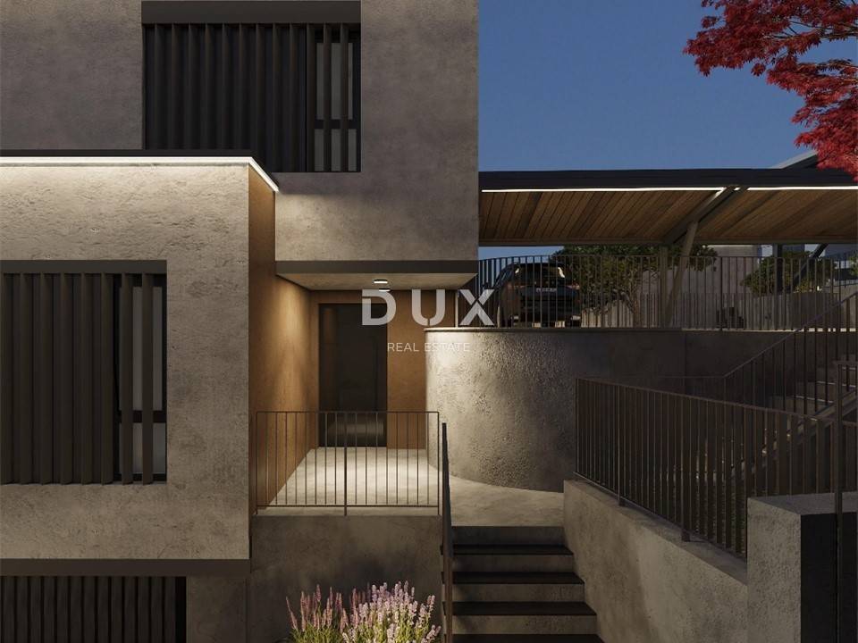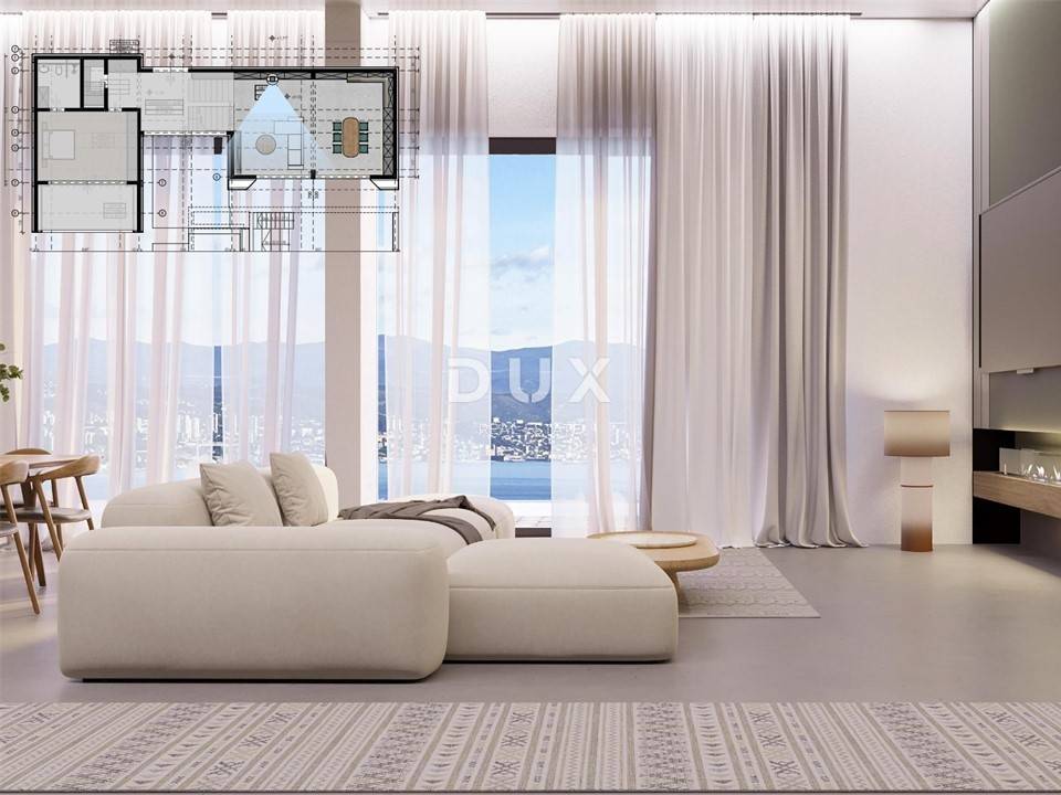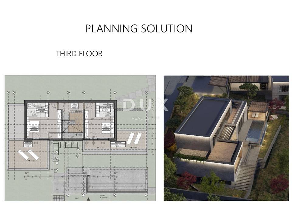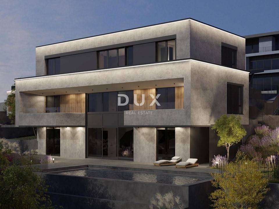 We present a special villa located on the Opatija Riviera above the very center of this beautiful city, only 470 meters as the crow flies from the sea, with a panoramic view of the sea, islands and mountains , with a beautiful large garden of 930 m2 and a swimming pool. It is a beautiful luxury villa on 3 floors, and consists of a spacious hallway, a wonderful and illuminated open space living room that communicates with the kitchen and dining room, from which there is a magnificent view of the sea through the glass walls. We emphasize that the master bedroom with en suite bathroom extends over the entire first floor and has a loggia of 11 m2. A large staircase leads to the 2nd floor with 2 luxurious bedrooms with en suite bathrooms, and each room is south-facing and has a beautiful view of the sea. Another bedroom with an en suite bathroom is located in the basement and has a nice view of the garden and pool, and on this level there is also a fitness room and a storage room. The special feature of this property is its quality construction and exceptional location near the center of Opatija, the Lungomare promenade, the Summer Stage and all the accompanying facilities. The villa will be built surrounded by lush greenery in a quiet cul-de-sac and will thus ensure privacy and comfort along with a wonderful experience of the Kvarner bay. The villa is located just a 1-minute drive from the center of Opatija and Slatina beach, thus ensuring a perfect stay and life in the beauty of the Adriatic - Opatija. Dear clients, the agency commission is charged in accordance with the General Terms and Conditions. https://www.dux-nekretnine.hr/opci-uvjeti-poslovanja