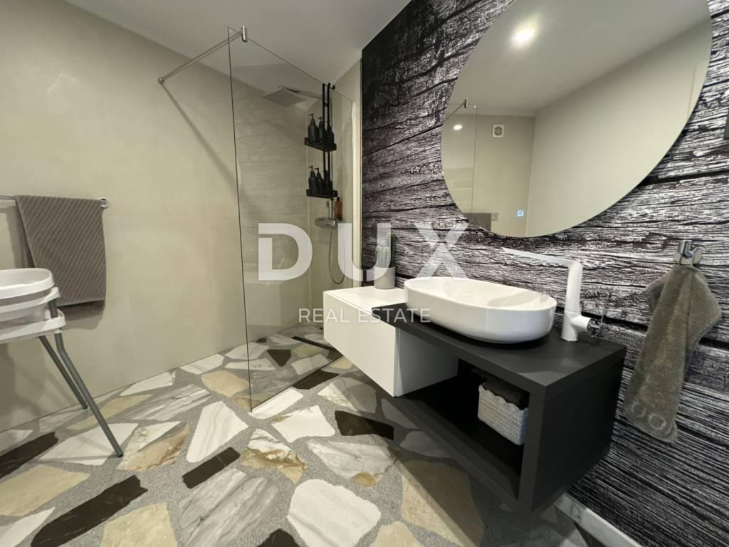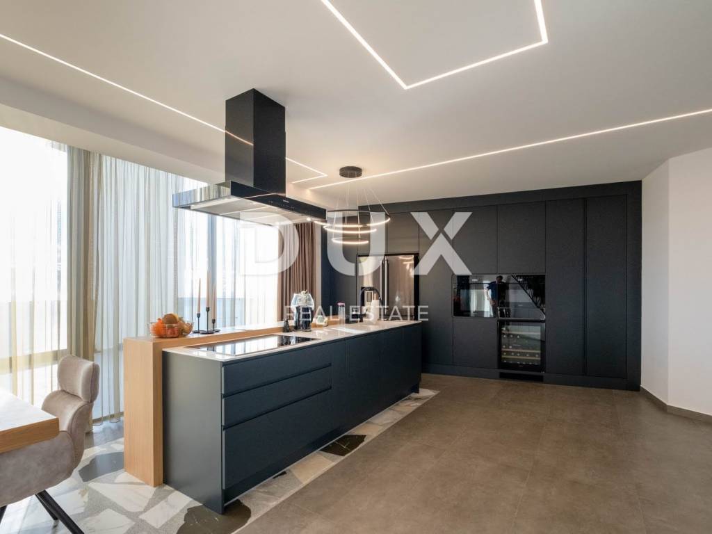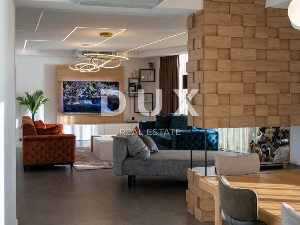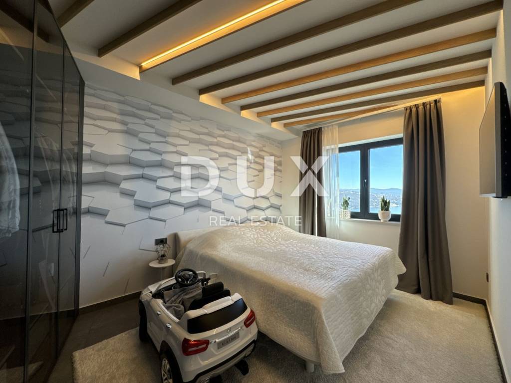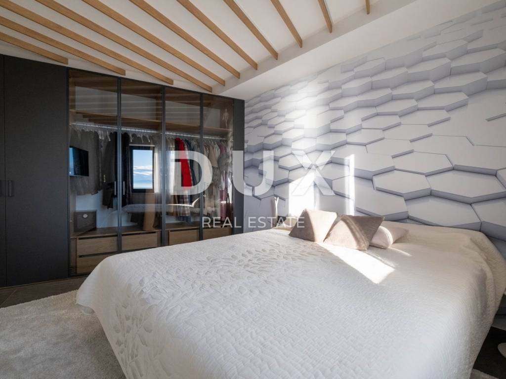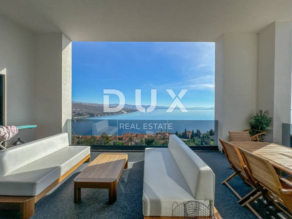Exclusive, furnished property for sale in Opatija. It is a unique penthouse above the city with a panoramic view of the sea. The penthouse extends over two floors, offering a luxurious open space living room with kitchen and dining room on the first floor, an area of 227m2. Large sliding rocks illuminate the space with natural light and allow an unobstructed view of the azure blue sea from every angle. The living room is connected to a spacious covered terrace with high ceilings, equipped with elegant garden furniture, ideal for enjoying relaxed evenings or socializing with guests. On the same floor, there is a guest bedroom with an en suite bathroom, as well as a guest toilet with a laundry room for added convenience. On the upper floor there are two bedrooms, one of which is the imposing master bedroom. enables an unforgettable morning sunrise experience and provides a spectacular view. In addition, the master bedroom offers a luxurious glass-enclosed bathroom and a private terrace that can also be heated and converted into a wellness and gym area. The property is equipped with smart built-in wardrobes and high-quality furniture, including a kitchen that has hardly been used. Sanitary ware and household appliances are of renowned brands, and underfloor heating provides additional comfort throughout the year. In addition, the master bedroom has a spacious walk-in closet, adding another layer of practicality and luxury. The penthouse has three parking spaces, and the building in which it is located is located in a quiet cul-de-sac, surrounded by a quality neighborhood, ensuring privacy and peace. The property currently represents the most serious offer of penthouses on the Opatija market, and the additional potential of the roof offers the possibility of building a swimming pool and an additional terrace according to one's own wishes and taste. This is an opportunity to live in a property that combines luxury, comfort and incredible views of the Adriatic Sea.