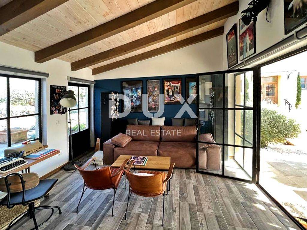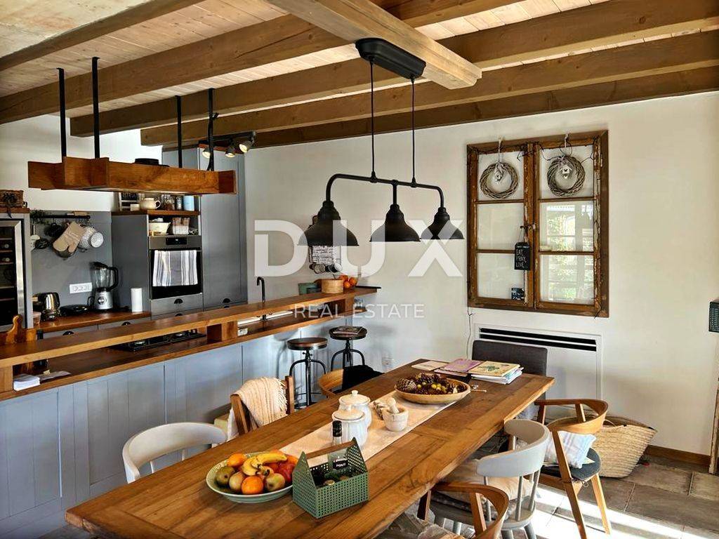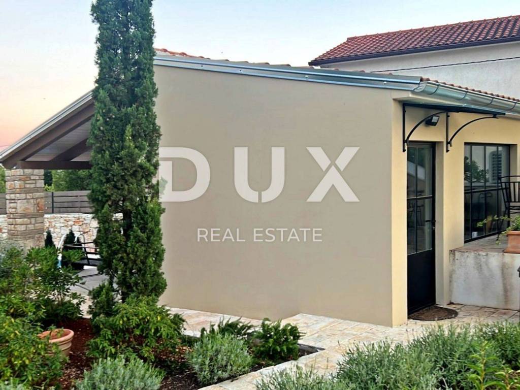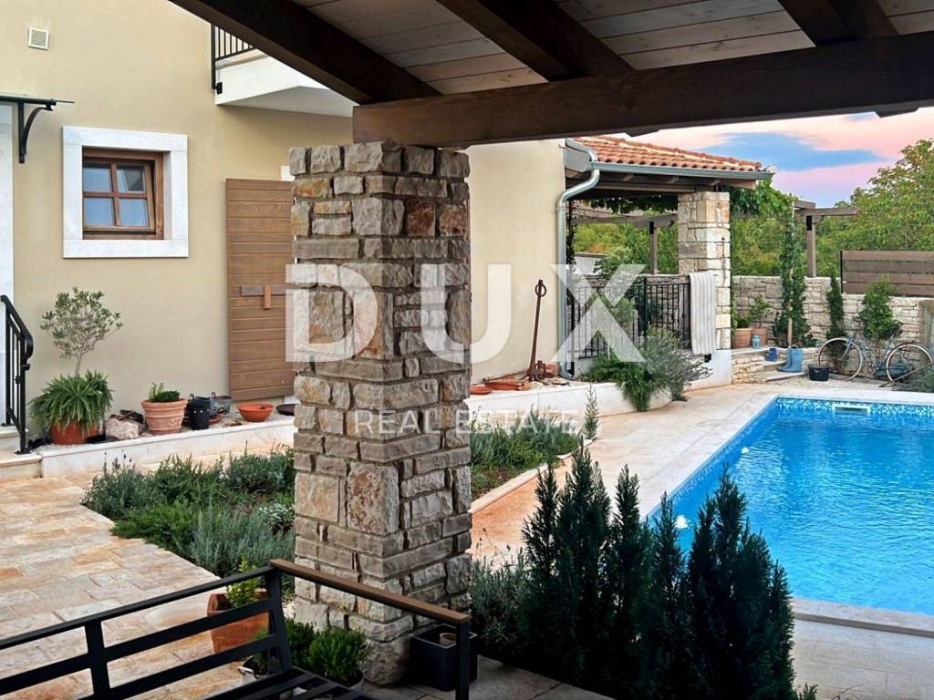 The lovely Renaissance town of Svetvinčenat is located on a rugged plateau surrounded by forests, pastures and vineyards. Svetvinčenat is located at 310 meters above sea level in the south of central Istria and is dominated by one of the most beautiful Renaissance squares in the country and the oldest and best preserved medieval castle in Istria. There are 22 settlements in the Municipality of Svetvinčenat, which is adorned with natural beauty, rich historical and cultural heritage, artistic manifestations and food and gastronomy tourism. Not far from the town of Svetvinčent, a comfortable house with a swimming pool is for sale. The house of timeless architecture is located in a gentle settlement, surrounded by nature, family homes and vacation homes, offering a perfect balance of rural surroundings and proximity to urban facilities. The interior of the house is fully adapted to the modern lifestyle and radiates an ambience filled with the warmth of wood and the freshness of stone with a combination of modern and rustic style furniture. The living area is divided into ground floor and first floor. The ground floor consists of a kitchen and a dining room with access to a covered terrace, a living room, a guest toilet and a storage room. The floor consists of four bedrooms with private bathrooms. Next to the house there is an auxiliary building in the function of a study room with a toilet and an exit to a covered terrace. The yard is fenced and landscaped and horticulturally arranged, and the 32 m swimming pool with a sun deck provides complete harmony. The location, structure and comfort make this property an ideal opportunity for a peaceful family life as well as an investment for the purpose of tourist rental. The seller of the property in question is a legal entity. Dear clients, the agency commission is charged in accordance with the General Business Conditions: www.dux-nekretnine.hr/opci-uvjeti-poslovanja