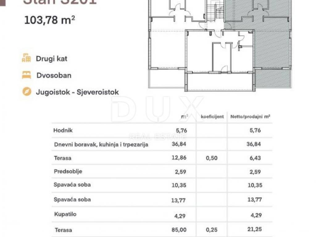 Beautiful luxury penthouse under construction in Privlaka near Zadar for sale. The apartment is located on the second floor of a luxury residential villa with a total of 10 residential units spread over two floors. The planned construction period is until the end of the first half of 2023. The apartment has a net living area of 104,76 m2, and consists of two bedrooms, a spacious living room, kitchen and dining room, one bathroom, hallway, hallway and terrace. On the upper floor there is a large roof terrace with a gross area of 85 m2 with a jacuzzi area. The apartment also has one parking space in the courtyard of the villa, and the beautiful swimming pool in the courtyard is shared by all tenants.