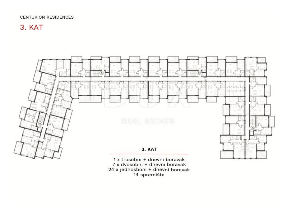 We proudly present to you an exclusive one-bedroom apartment with an elevator in one of the most prestigious new buildings in Umag. This spacious apartment with a total area of 61 m2 is located on the third floor of this imposing residential building. The apartment offers elegance and comfort, it consists of a spacious living room with a modern kitchen, a luxurious bedroom, an elegant bathroom, and a loggia of 11 square meters. The apartment also comes with a storage area of 3.07 m2, one garage parking space, making your everyday life extremely practical. This apartment building was built with a professional approach and attention to detail. The building is designed from reinforced concrete monolithic construction with mezzanine panels for additional safety and stability. Inside the apartments, partition walls are made with double-thick plasterboard coverings, providing excellent thermal and sound insulation. The facade cladding is in the ETICS system with thermal insulation 10 cm thick, ensuring energy efficiency. New generation high-quality PVC carpentry with electric blinds provides additional comfort and safety. Each apartment is equipped with a top multisplit heating and cooling system, ensuring perfect temperature and economy. The apartments have their own meters for water and electricity, and sanitary water is heated using an electric boiler. In addition, each apartment has a telephone, antenna, TV and Internet connection, with a built-in video intercom for greater security. The apartment is covered with high-quality parquet in the rooms and living room, while the corridors and hallways are equipped with elegant tiles. With the highest quality materials and equipment, this apartment not only provides extraordinary comfort for living, but is also ideal for renting for tourist purposes. The planned completion of construction is at the end of 2024, which will allow you to quickly enjoy all the advantages of this luxury apartment. The location is perfect, just 700 meters from the sea and the center of Umag, which allows you to enjoy all the charms of this beautiful Mediterranean city. General specifications of the building: Ground floor: - 1x studio apartment with garden - 18x apartments with one bedroom, living room, terrace and garden - 5x apartments with two bedrooms, living room, terrace and garden - 43x storage room 1st floor: - 26x apartments with with one bedroom, living room, terrace and garden - 7x apartments with two bedrooms, living room, terrace and garden - 16x storage room 2nd floor: - 26x apartments with one bedroom, living room, terrace and garden - 7x apartments with two bedrooms, living room, terrace and garden - 16x storage room 3rd floor: - 24x apartments with one bedroom, living room and balcony - 7x apartments with two bedrooms, living room and balcony - 1x apartment with three bedrooms, living room , balcony and loggia - 14x storage Underground garage: - 74 parking spaces - 33 storage spaces Ground parking: - 26 covered parking spaces - 82 uncovered parking spaces Do not miss the opportunity to become the proud owner of this luxury apartment in Umag and enjoy an exclusive life experience in one of the most attractive new buildings on the market. For additional information and viewing of the apartment, contact our agency today. Dear clients, the agency commission is charged in accordance with the General Terms and Conditions. www.dux-nekretnine.hr/opci-uvjeti-poslovanja