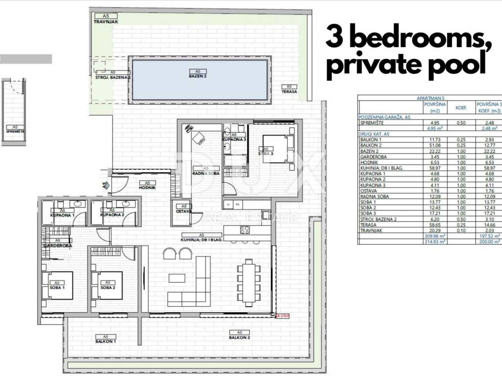 From the Dux offer, we highlight a special new building with 8 luxury apartments near the center of Opatija of top quality. This rare and powerful building in the construction phase of 2023-2024 is located only 250 meters as the crow flies from the sea and the Lungomare. The building is located in a quiet side street and offers a panoramic view of the sea. With its easy access to the city center, this home offers an excellent balance between elegant suburban living and the rich array of amenities that the city of Opatija has to offer. Exclusive apartment A5 on the second floor with a total net size of 217.06 m2 (GROSS 315m2) consists of hallway, kitchen + living room + dining room 59m2, 3 bedrooms, 3 bathrooms, study, south balcony 63m2 and terrace 59m2 with private pool 22m2 + garden (lawn). From every corner of the apartment there is a panoramic view of the sea and the center of Opatija. The project is being built on a plot of 1700 m2 and includes a large underground garage, from which the apartment has 3 garage spaces and a large storage room. heating/cooling underfloor heating + heat pump exceptional construction class, Italian ceramics, branded sanitary ware Own storage room Large underground garage Elevator Video surveillance and alarm Panoramic sea view Future Mediterranean horticulture will delight you, while enjoying the silence of a peaceful environment . Perfect investment or opportunity for people looking for 4 walls on the sea CLOSE TO OPATY. Walking to the sea takes 7 minutes, or 500 meters on a slightly downhill path. The great advantage of this location is silence, privacy, a view of the sea, the greenery of Učka and the proximity of Opatija. IN THE VAT SYSTEM - the property is owned by the company - the possibility of submitting a request for a VAT refund The price includes 3 garage parking spaces, internal storage. Move-in will be 12/23 UNIQUE OPPORTUNITY FOR NEW BUILDING ON THE OPATIJA RIVIERA!