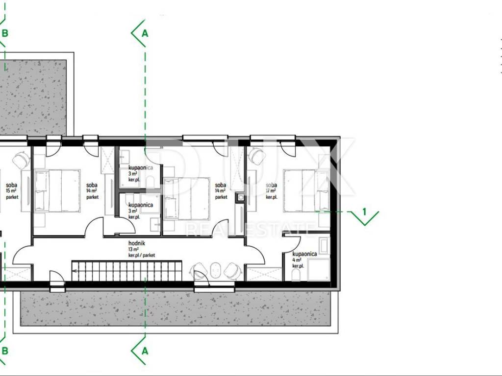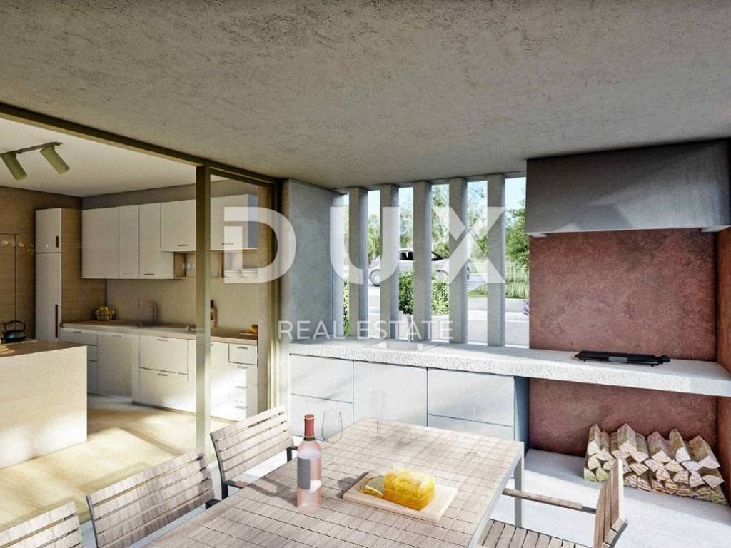 On the southeastern coast of Istria, where green hills meet the sea, where nature and heritage meet, there are two towns of similar size but with different but mutually complementary characters - Labin and Rabac. The picturesque town of Labin rises on a hill 320 meters high, only five kilometers from the white pebble beaches in Rabac. Intertwined with rich history and mining that marked this region, Labin, which was declared an independent republic for a short time, is today a fascinating city of contradictions; old and new, history and present, tourism and art. Not far from the town of Labin, a modern, comfortable house with a swimming pool is for sale. With its tame architecture, it does not disturb the environment but creates a synergy of natural surroundings and modern design. It was conceived as one residential unit that extends over two floors with a modern, airy, natural light-filled interior that exudes elegance and provides a high level of comfort. The ground floor consists of an open concept space that unites the living room, dining room and kitchen with access to a covered terrace containing a summer kitchen. The floor plan of the ground floor complements the wellness area with sauna, toilet and two storage rooms. Upstairs there are four bedrooms with their own bathrooms. Heating/cooling of the house is provided by a fan coil system and a floor heating system via a heat pump, while thermal solar collectors are installed for the preparation of hot sanitary water. The yard is completely fenced and elegantly decorated with grass and gravel areas and Mediterranean plants. The central place is occupied by a swimming pool of 28 m with a sunbathing area, and next to the house there is also an auxiliary facility of 17 m. The location, structure and comfort make this property an ideal opportunity for a peaceful family life as well as an investment for the purpose of tourist rental. The stated price refers to the turnkey phase with the possibility of additional arrangement of the spacious garden with price correction. Dear clients, the agency commission is charged in accordance with the General Business Conditions: www.dux-nekretnine.hr/opci-uvjeti-poslovanja