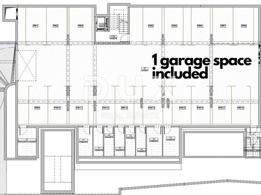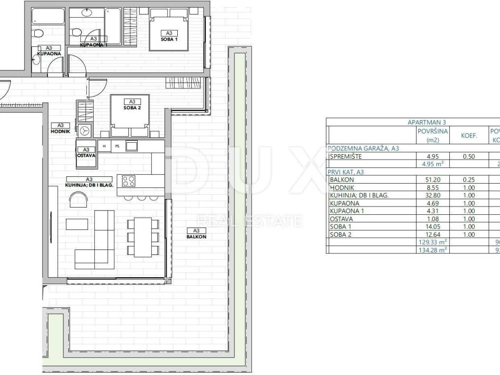 From the Dux offer, we highlight a special new building with 8 luxury apartments near the center of Opatija of top quality. This rare and powerful building in the construction phase of 2023-2024 is located only 250 meters as the crow flies from the sea and Lungomare. The building is located in a quiet side street and offers a panoramic view of the sea. With its easy access to the city center, this home offers an excellent balance between elegant suburban living and the rich array of amenities that the city of Opatija has to offer. Exclusive apartment A3 with a total net size of 120.04m2 has a balcony of up to 51m2 (net 13m2) with a panoramic view of the sea and the center of Opatija. Open space living room with kitchen and dining room 33m2, hallway, two bathrooms, wardrobe, and two larger bedrooms. The project is being built on a plot of 1700 m2 and includes a large underground garage, from which the apartment has 3 garage spaces and a large storage room. heating/cooling underfloor heating + heat pump exceptional construction class, Italian ceramics, branded sanitary ware Own storage room Large underground garage Elevator Video surveillance and alarm Panoramic sea view Future Mediterranean horticulture will delight you, while enjoying the silence of a peaceful environment . Perfect investment or opportunity for people looking for 4 walls on the sea CLOSE TO OPATIJA. Walking to the sea takes 7 minutes, or 500 meters on a slightly downhill path. The great advantage of this location is silence, privacy, a view of the sea, the greenery of Učka and the proximity of Opatija. IN THE VAT SYSTEM - the property is owned by the company - the possibility of submitting a request for a VAT refund The price includes one garage parking space, internal storage. Move-in will be 12/23 UNIQUE OPPORTUNITY FOR NEW BUILDING ON THE OPATIJA RIVIERA!