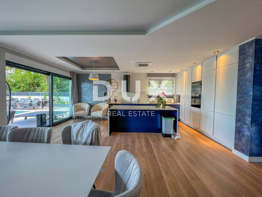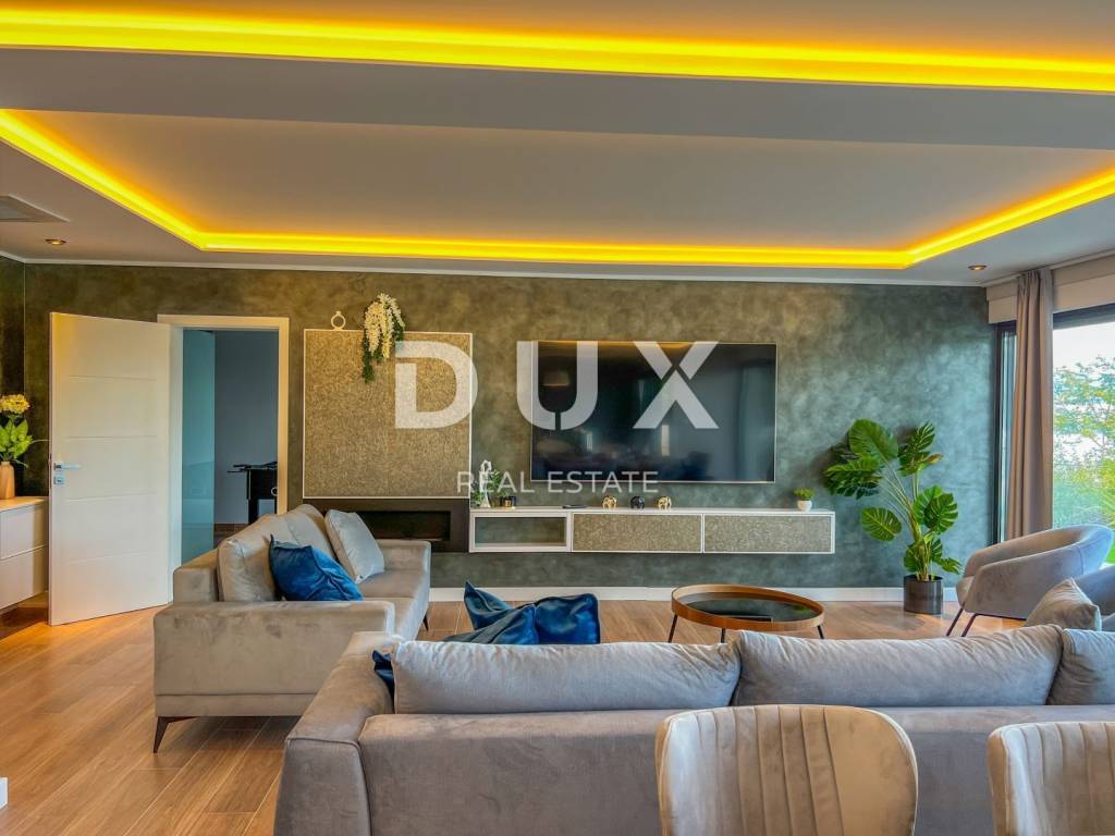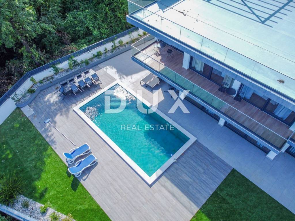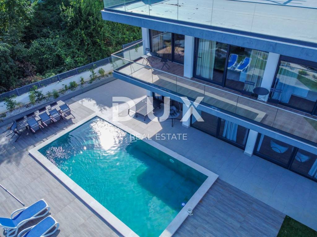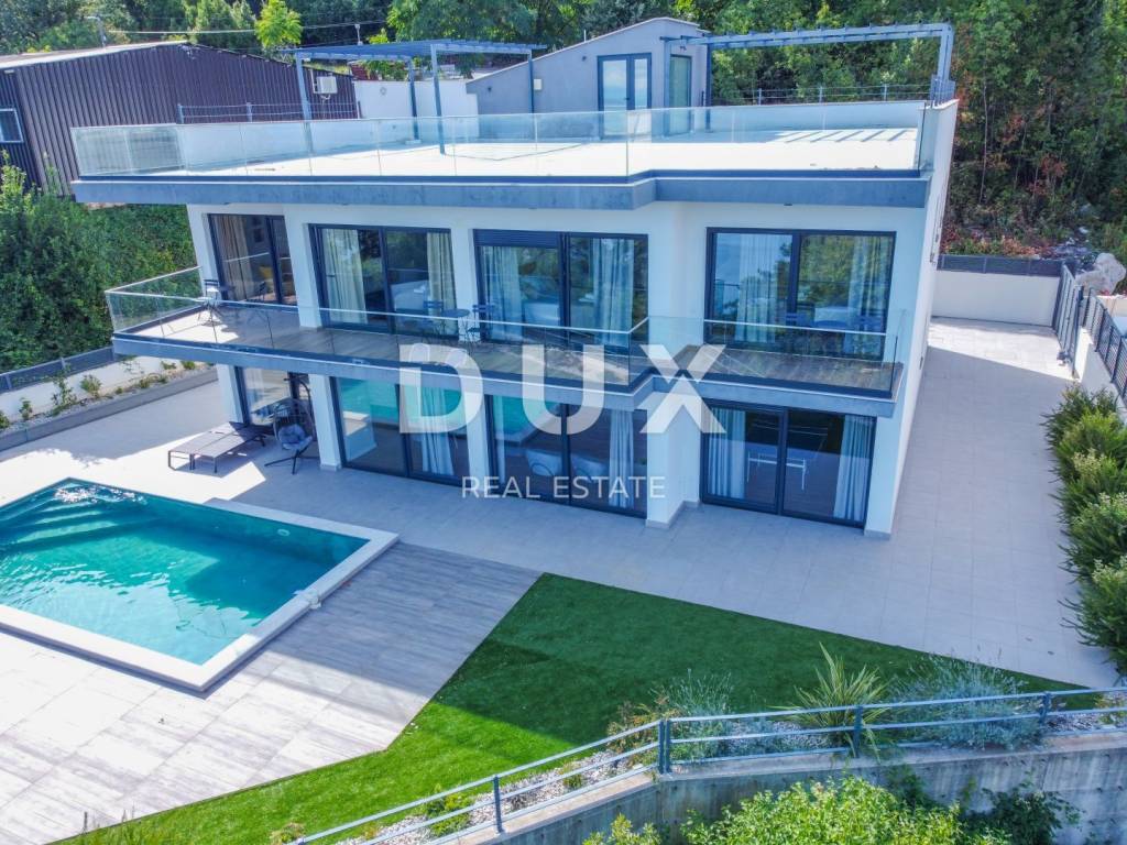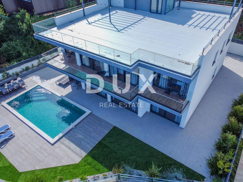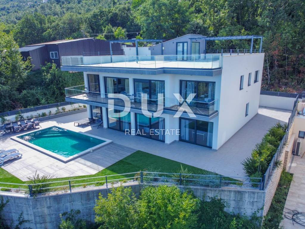 We are proud to present this incredibly beautiful villa, perfect for families looking for an exclusive villa in a quiet environment near the sea and Opatija. Located in a private and quiet street, this villa offers 400m2 of luxurious living space. The house consists of a total of 5 spacious bedrooms, each of which has its own bathroom for your maximum privacy and comfort. It is particularly noteworthy that the south-facing bedrooms are equipped with an exit to the terrace, which allows you to start every morning with a refreshing view and natural light. This villa is ideal for families looking for a spacious and elegant home that combines luxury features with the comfort of everyday life. Its carefully designed details, such as underfloor heating, a modern kitchen, a private pool and a roof terrace, will provide you with an extraordinary living experience. In addition, a private garden and advanced security systems will ensure you a peaceful and safe life. This property stands out with a number of premium features: Large Heated Pool: You can start your day with a refreshing swim in the private pool which is heated to enjoy all year round. Underfloor heating: The entire house is equipped with underfloor heating to ensure comfort and warmth in all rooms. Safety: Your safety is our priority. The house is equipped with a private fenced yard, security cameras and an alarm system. Heat pumps: This house is equipped with a heat pump for heating inside the house and a separate heat pump for the pool, which will allow you to enjoy the pool all year round. Luxuriously furnished: The villa is sold fully furnished with top quality furniture, so you can move in and enjoy the luxury immediately. Playroom for children: For families with children, there is a special playroom where the youngest members of the family can spend their free time. Modern kitchen and built-in wardrobes: The kitchen is equipped with the latest equipment and custom built-in wardrobes provide plenty of storage space. Spacious roof terrace: The large roof terrace with an area of 200 square meters offers a wonderful panoramic view of the sea. The terrace is equipped with water and electricity connections, which is perfect for relaxing moments outdoors or spending time with friends and family. The house is located a 3-minute drive to Lovran, and a 10-minute drive to the center of Opatija. (Only 2.5 km to the sea)