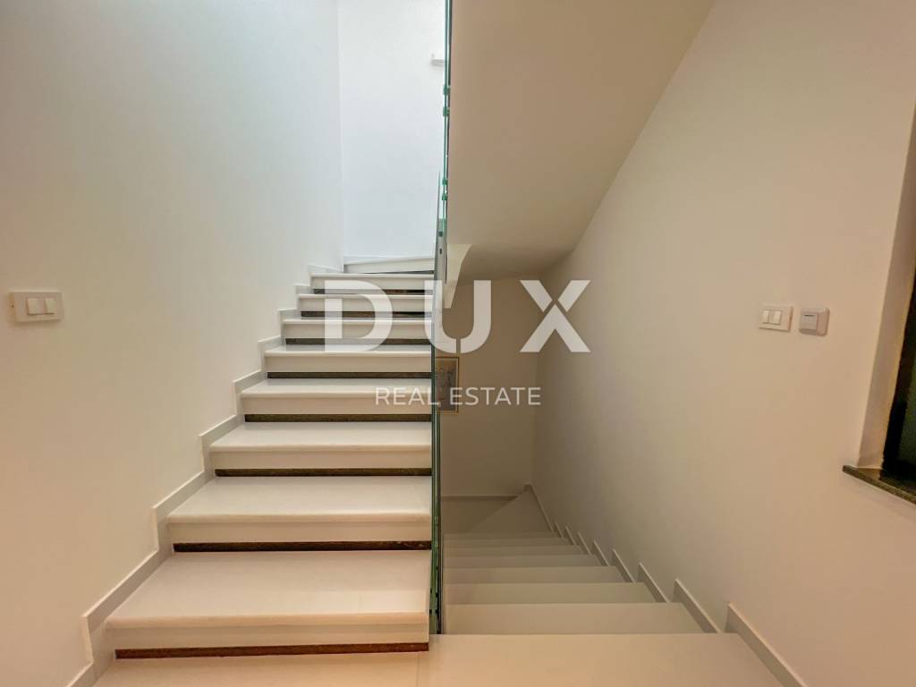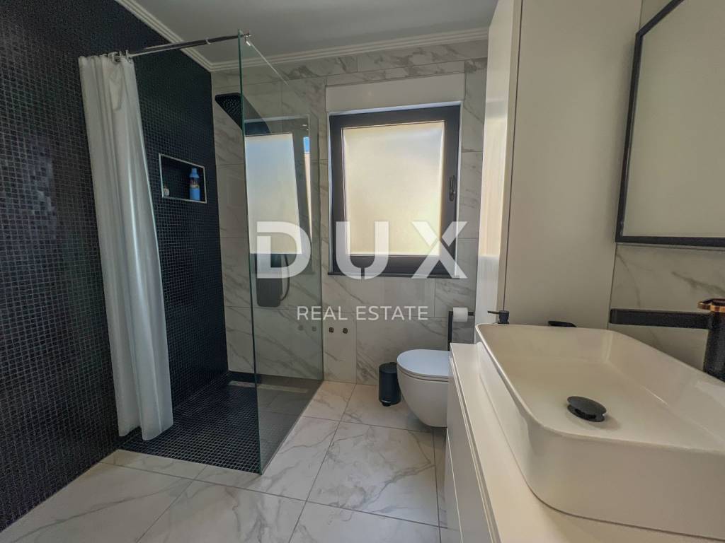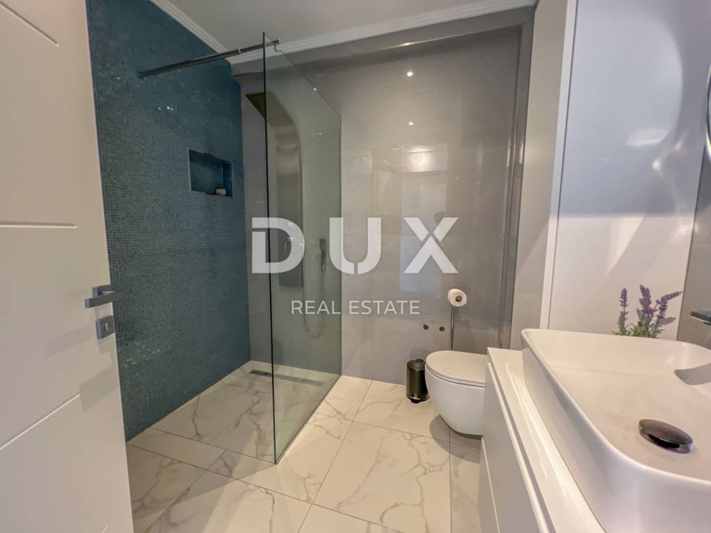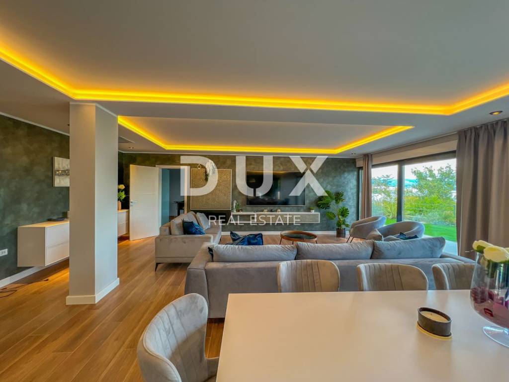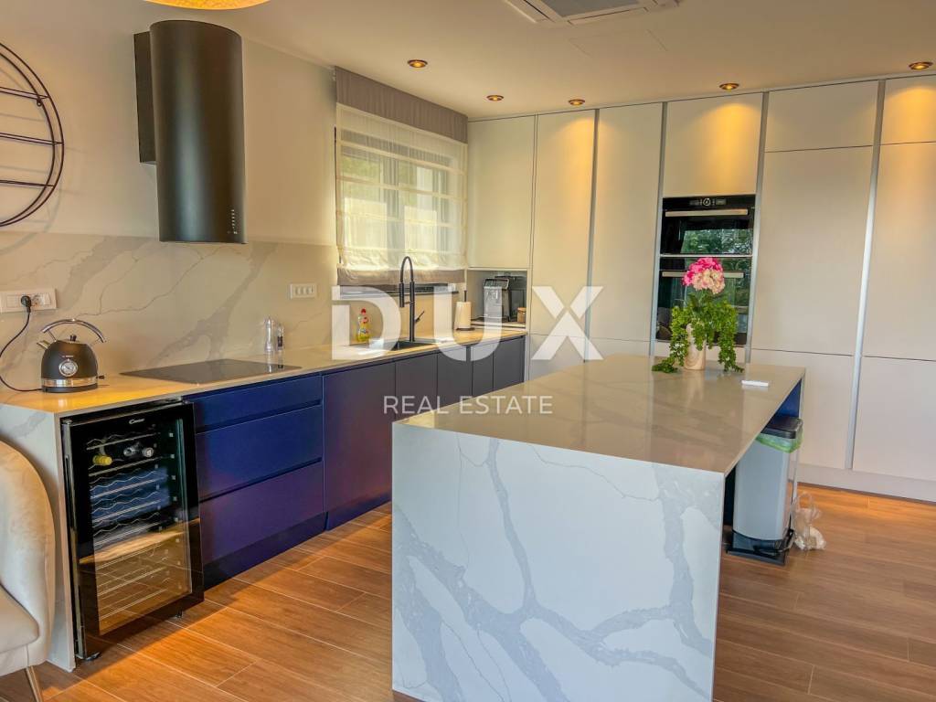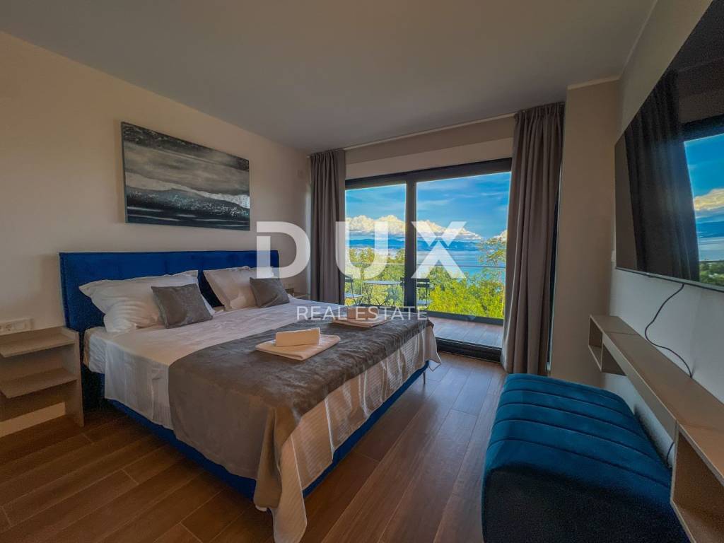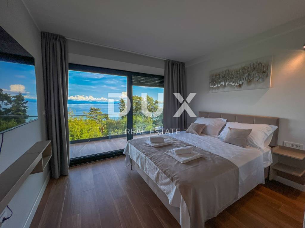 We are proud to present this incredibly beautiful villa, perfect for families looking for an exclusive villa in a quiet environment near the sea and Opatija. Located in a private and quiet street, this villa offers 400m2 of luxurious living space. The house consists of a total of 5 spacious bedrooms, each of which has its own bathroom for your maximum privacy and comfort. It is particularly noteworthy that the south-facing bedrooms are equipped with an exit to the terrace, which allows you to start every morning with a refreshing view and natural light. This villa is ideal for families looking for a spacious and elegant home that combines luxury features with the comfort of everyday life. Its carefully designed details, such as underfloor heating, a modern kitchen, a private pool and a roof terrace, will provide you with an extraordinary living experience. In addition, a private garden and advanced security systems will ensure you a peaceful and safe life. This property stands out with a number of premium features: Large Heated Pool: You can start your day with a refreshing swim in the private pool which is heated to enjoy all year round. Underfloor heating: The entire house is equipped with underfloor heating to ensure comfort and warmth in all rooms. Safety: Your safety is our priority. The house is equipped with a private fenced yard, security cameras and an alarm system. Heat pumps: This house is equipped with a heat pump for heating inside the house and a separate heat pump for the pool, which will allow you to enjoy the pool all year round. Luxuriously furnished: The villa is sold fully furnished with top quality furniture, so you can move in and enjoy the luxury immediately. Playroom for children: For families with children, there is a special playroom where the youngest members of the family can spend their free time. Modern kitchen and built-in wardrobes: The kitchen is equipped with the latest equipment and custom built-in wardrobes provide plenty of storage space. Spacious roof terrace: The large roof terrace with an area of 200 square meters offers a wonderful panoramic view of the sea. The terrace is equipped with water and electricity connections, which is perfect for relaxing moments outdoors or spending time with friends and family. The house is located a 3-minute drive to Lovran, and a 10-minute drive to the center of Opatija. (Only 2.5 km to the sea)