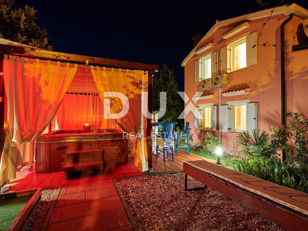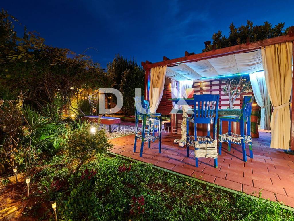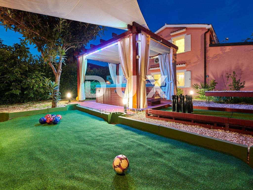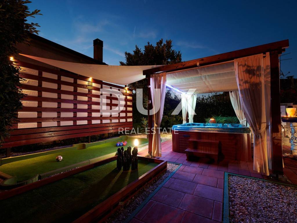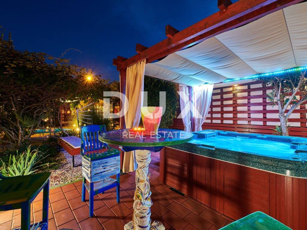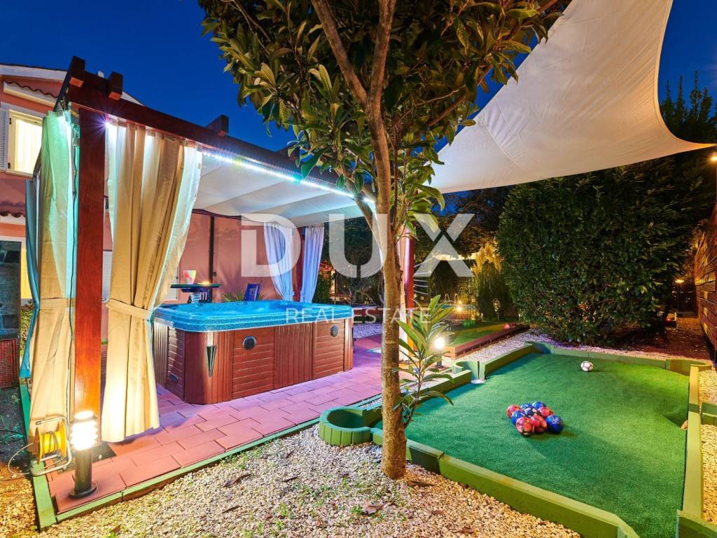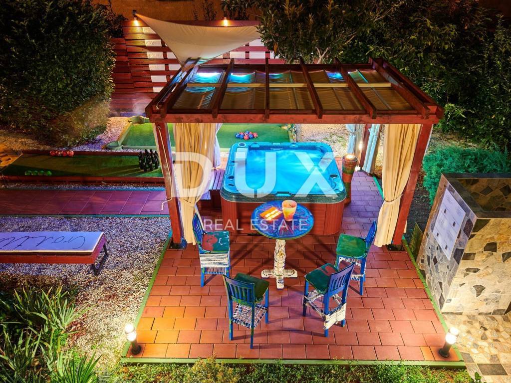 On the outskirts of Umag, on a plot of 700 m2, this villa is located on two floors, with a total area of 168 m2. The ground floor consists of a spacious living room connected to the kitchen and dining area, two bedrooms and two bathrooms. Internal stairs lead to the first floor where there are two bedrooms and one bathroom. The garden of the villa with a terrace, swimming pool and jacuzzi has additional sports facilities. Villa, categorized for 10 people for sale is furnished. This villa is an excellent opportunity for financial investment and renting for tourist purposes as well as for a quiet family life on the outskirts of the city, and yet close to all amenities.