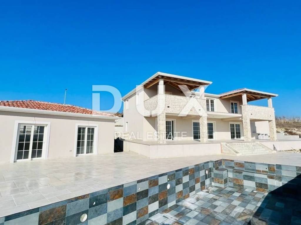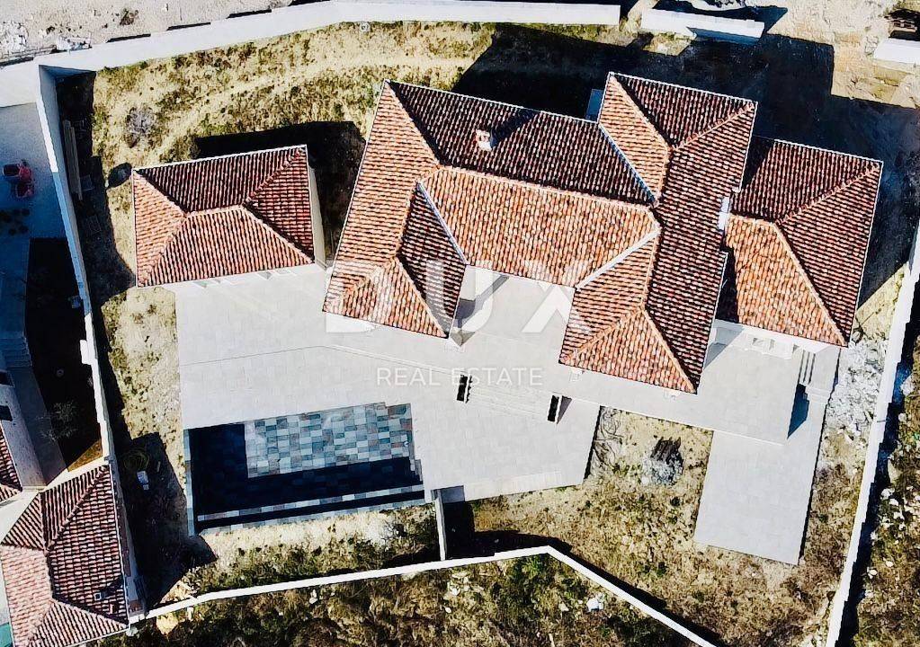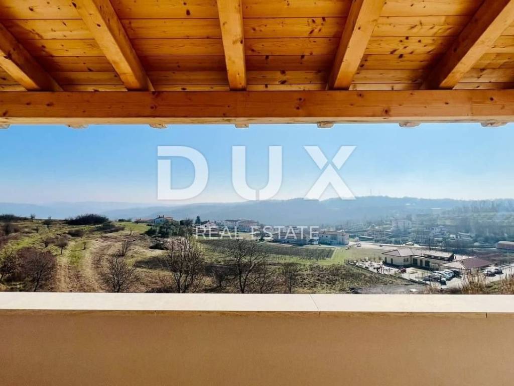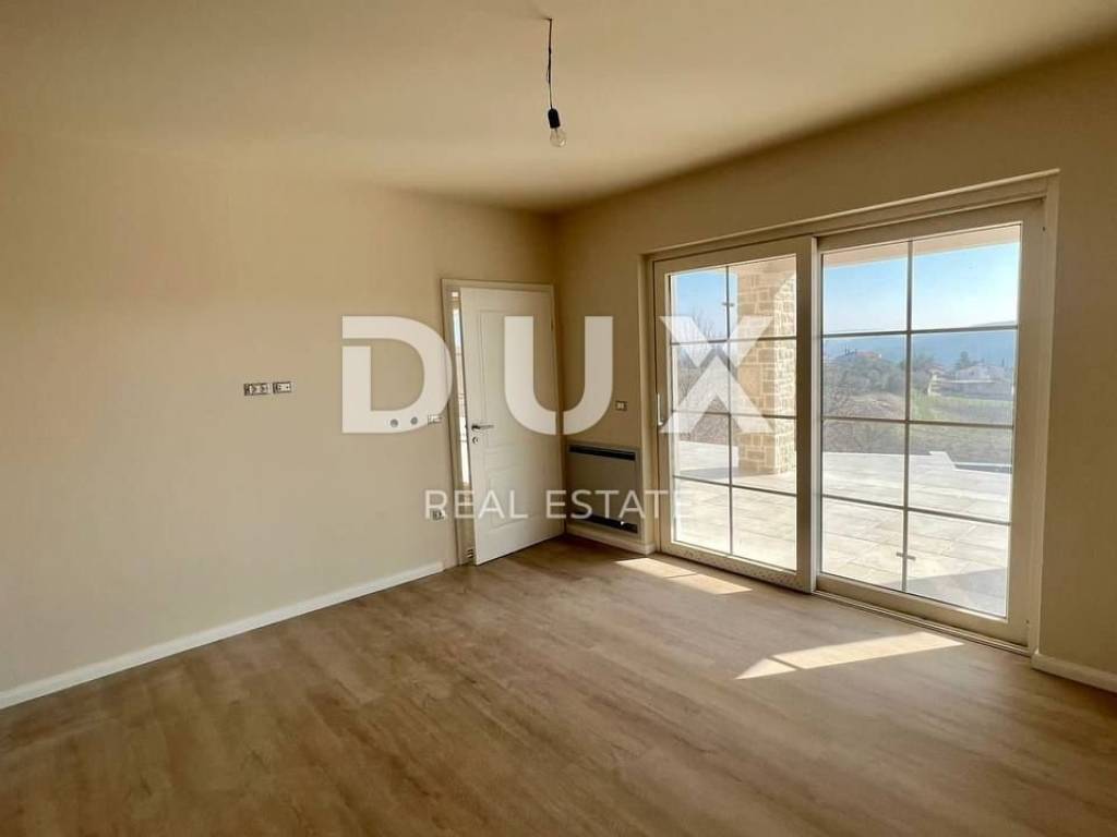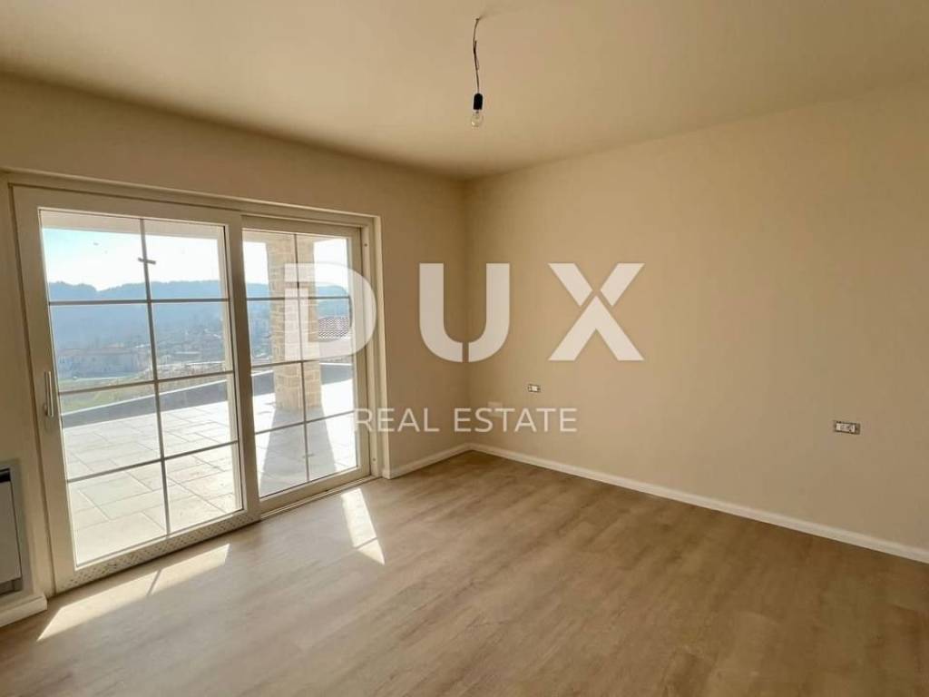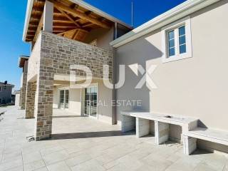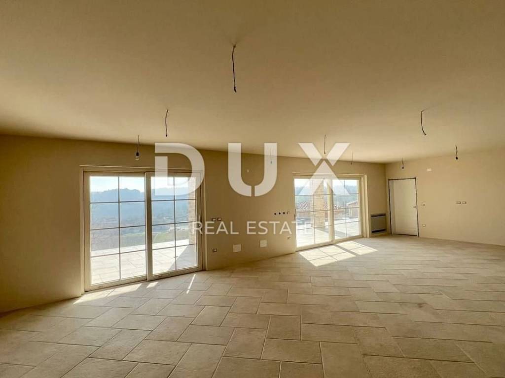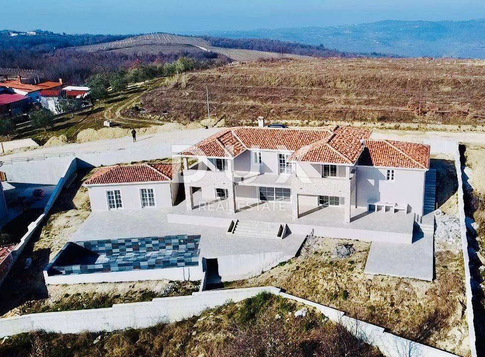 In the beautiful Vižinada, on top of a hill with a beautiful view of the interior of Istria, this imposing 4-bedroom villa is for sale. The ground floor of this villa consists of a spacious kitchen with dining area and living room with fireplace, one bedroom with bathroom and guest toilet. Upstairs are 3 large bedrooms, each with its own bathroom and balcony. Heating in the house is provided under and through a fan coiler, as well as cooling. In front of the house will be an overflow pool measuring 12x4 m, with an integrated whirlpool. In the yard of 1200 m2, which will be planted with Mediterranean plants, there will be a summer kitchen with bathroom, sauna and whirlpool, for the complete enjoyment of both owners and their guests. The house also has a garage. This villa is built with the highest quality materials currently available on the market. The deadline for completion and moving in of future owners is scheduled for autumn 2022.