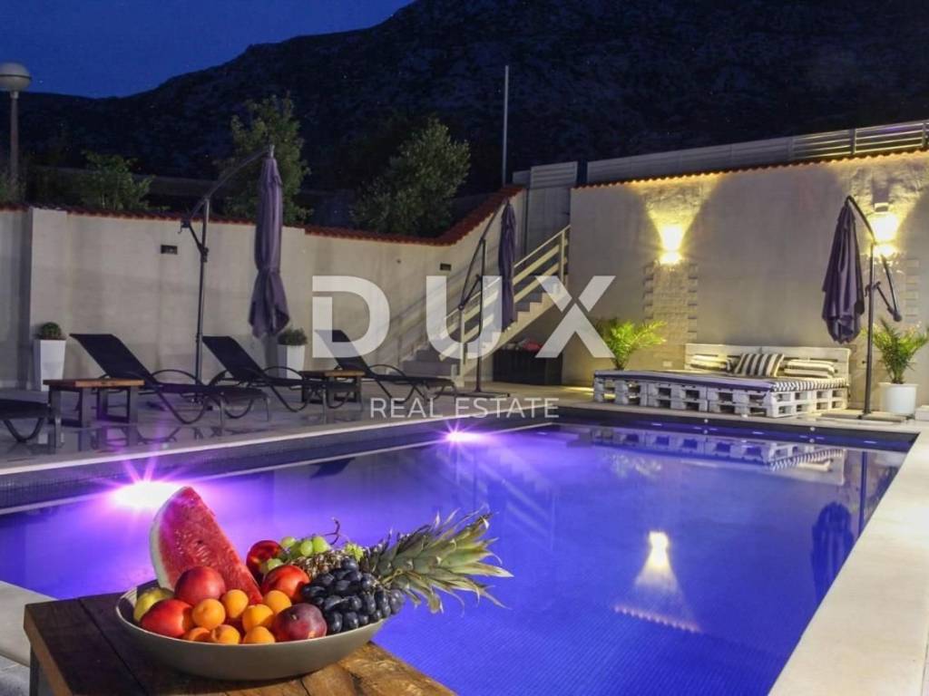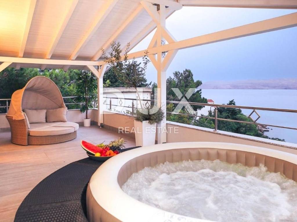 Beautiful luxury villa for sale located 1st row from the sea in Cesarica near Karlobag. The superb position of the villa, located only 20 m from the sea and the beautiful pebble beach, offers an unforgettable view of the crystal-clear Adriatic Sea and the island of Pag. Built on a plot of 480 m2, the villa has a total living area of 280 m2. It was built in 2011 and completely renovated in 2019. On the ground floor of the villa there is an entrance to a separate apartment with one bedroom and bathroom, additional toilet, kitchen, dining room, living room and terrace. On the first floor is the entrance to the second part of the villa where there is a spacious living room, modern kitchen, dining room, hallway, one bedroom, bathroom and a spacious terrace. On the second floor there are three bedrooms, a bathroom and a large terrace with a jacuzzi and a view of the sea. All rooms are air-conditioned and equipped with smart television. In the courtyard of the villa there is a spacious sunbathing area, a large swimming pool with heating and counter-current swimming. In the yard there is also a barbecue and a parking lot with three private parking spaces. The villa is located in the small picturesque coastal town of Cesarica, located between the Velebit mountain and the Adriatic Sea. The town of Karlobag is 7 km away, and the town of Prizna is 11 km away. On the south side is the island of Pag, known for its specific geography and superb gastronomic specialties, which can be reached by ferry from Prizna.