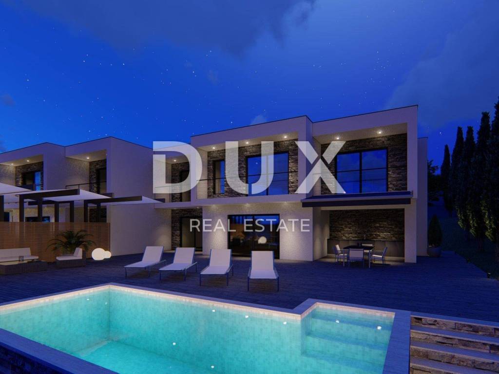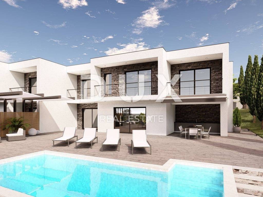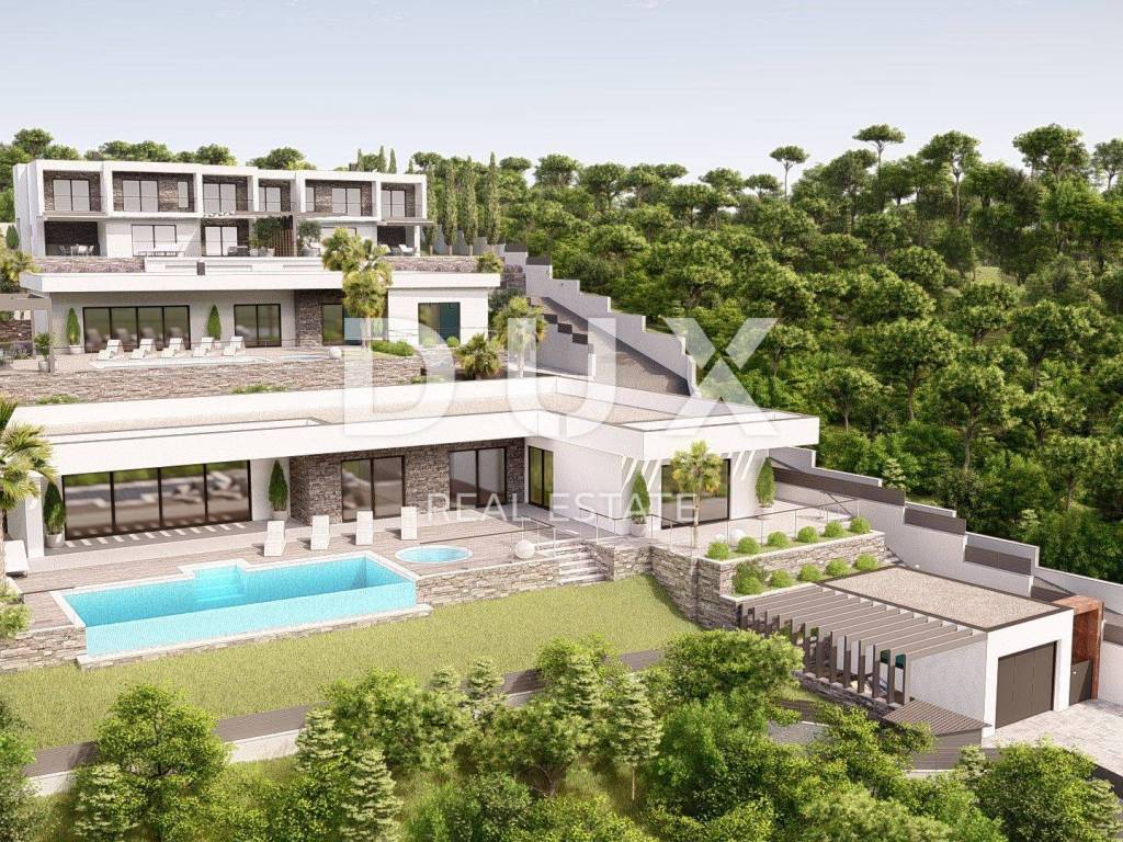 We are selling a beautiful luxury property with two semi-detached villas and a panoramic view of the sea! The villas are located in an excellent location on a hill in a peaceful and green environment. Each villa consists of a ground floor with a spacious living room, a kitchen with a dining room, a laundry room, a storage room, a covered terrace and two loggias. Upstairs there are three bedrooms, each with its own bathroom and exit to the loggia where an incredible view of the sea and nearby islands awaits you. A very beautiful space that will complement the beautiful sunsets throughout the year. The garden of each villa includes a large garage for two vehicles, an infinity pool, a garden, a barbecue, and additional terraces and a sunbathing area. The villa is part of a large project of several luxury residential units in that microlocation. The project belongs to the very top of the quality and luxury of the city of Crikvenica, not only because of the location, but also because of the investor himself, who is well known in the region.