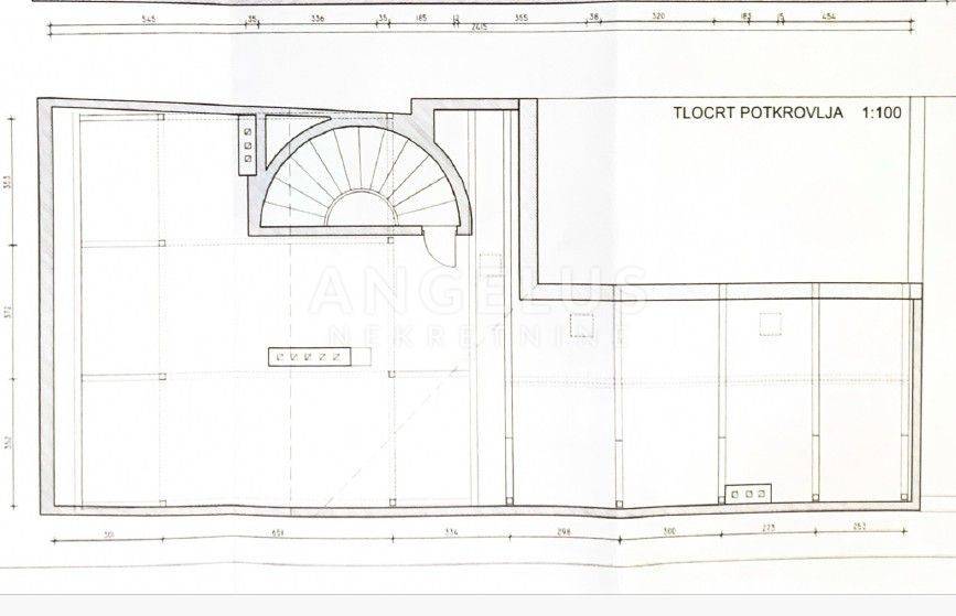 Na zadnjoj etaži je prostrani neuređeni tavan. Ukupna kvadratura je 445m2, ali neto obračunskog prostora. Brutto kvadratura je puno veća. Etažiranje je u postupku.