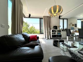 The apartment consists of an entrance hall, one large room - "open space" oriented to the south and west with a fully equipped kitchen, dining room and living room from which there is a beautiful view of the surrounding hills, two bedrooms of different sizes, which share a bathroom and a master bedroom with its own bathroom, the larger of which has a bathtub and the smaller one has a shower, toilet, garage on the ground floor of the building and a parking space in front of the garage.